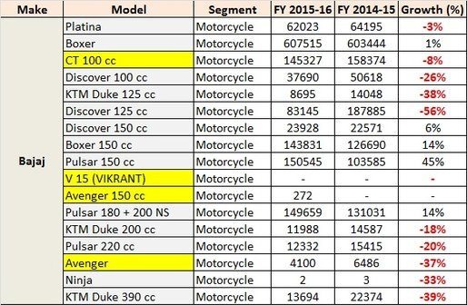 One of Honda’s highest selling products, the Unicorn 150, was discontinued for some period and thus it saw a 96% fall in exports. Bajaj’s 150cc and above segment did not perform that well either and apart from the Bajaj Pulsar 150, 180 and 200NS saw some positive growth. The Pulsar 150 alone grew by 45% in FY2015-16 exports. Even the KTM 200 Duke and 390 Duke saw negative exports but that’s mainly because the models would be soon replaced by all new 2017 variants.