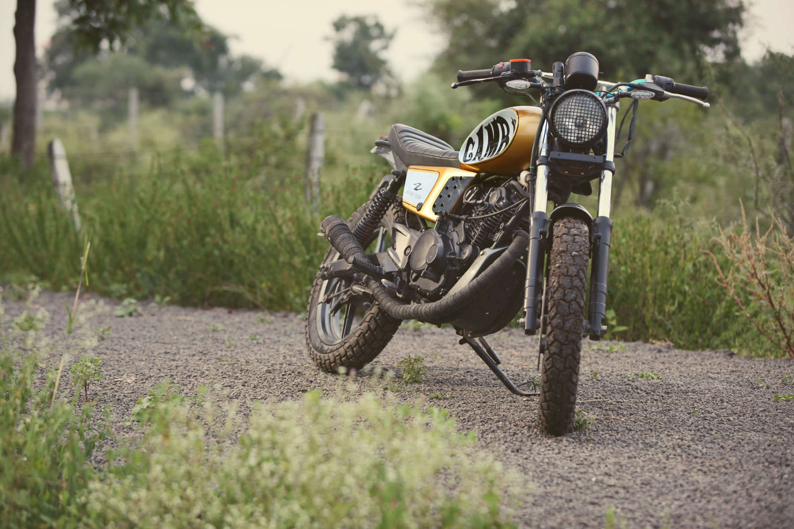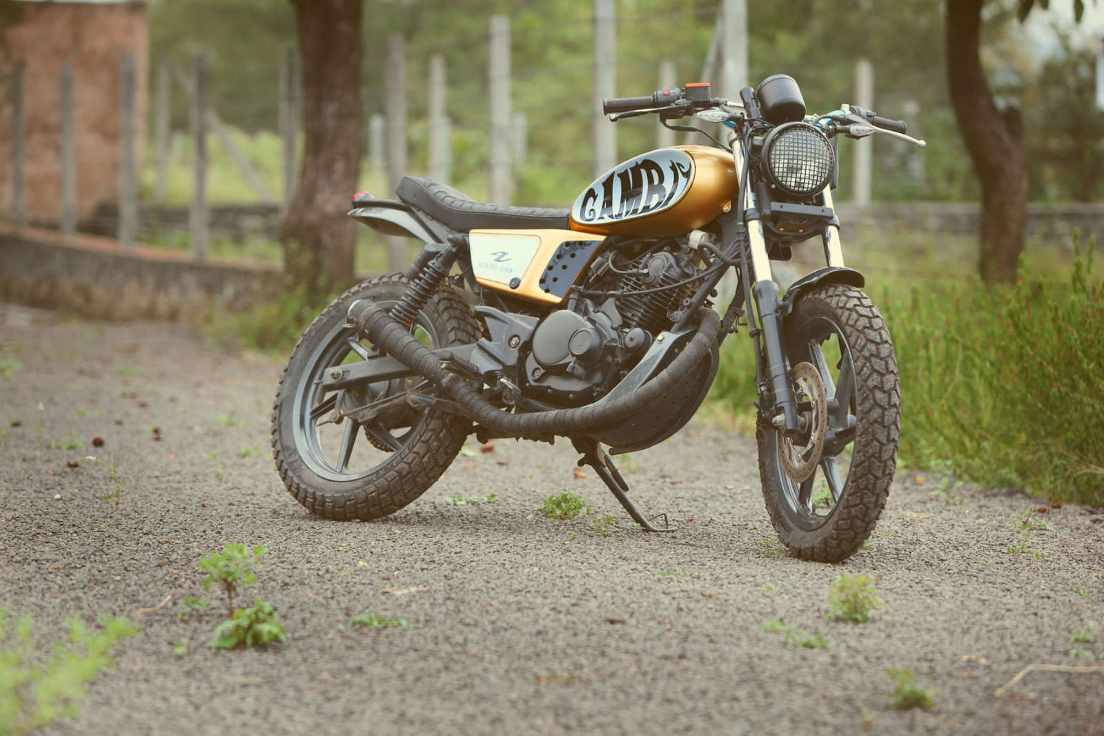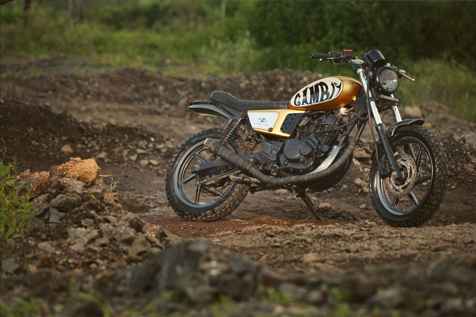 Up front, a classic round headlamp sits pretty along with some after-market, contemporary indicators spoiling the retro theme. There’s also a smaller- presumably louder exhaust and a new, custom under-body cowl to prevent those stone chips from creating havoc. Being a scrambler with some rough road credo, one gets a couple of knobby tires wrapped around the stock Pulsar alloys. Mechanically, the Gambit continues unchanged from the Bajaj Pulsar 180.