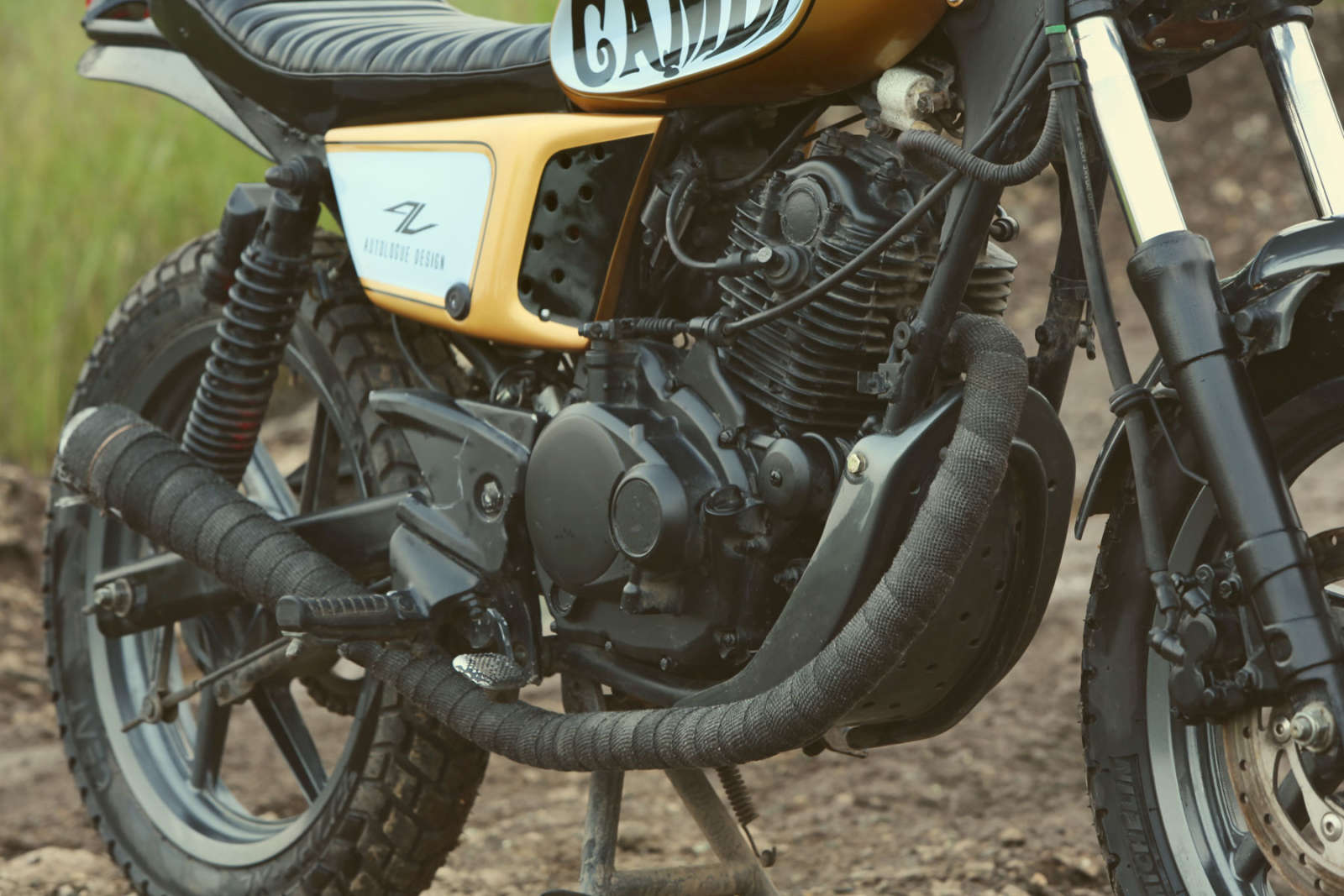 The tank is rather unique- a classic teardrop shape with punched in, concave sides with Gambit lettering in period typography. The new side panels feature minimal curves and are custom painted in a lustrous shade of yellow with white highlights, along with the tank. There’s a new scrambler-perfect, ribbed seat that looks accommodating enough for a solo rider- girlfriends be damned. Also, the Pulsar’s rear footrest mountings have been sawed in half. The rear is even more minimalist, with a lone, round tail lamp being the only cherry.