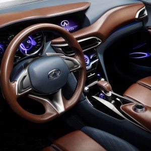 The QX30 Concept rides on 21-inch wheels, has a low, satin chrome front bumper with big side openings, hardy kick plates under the doors and a tough-looking but sculpted skid plate in the rear. Even the roof racks have gone beyond their functional use. According to Infiniti, they artistically “obstruct” the rear passenger’s view through the glass roof, resulting in an inimitable perspective of the outside.