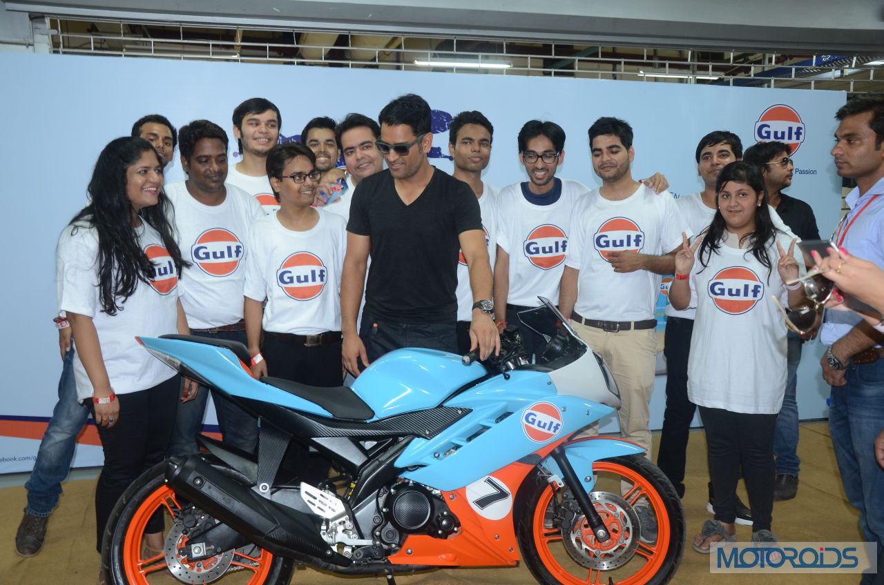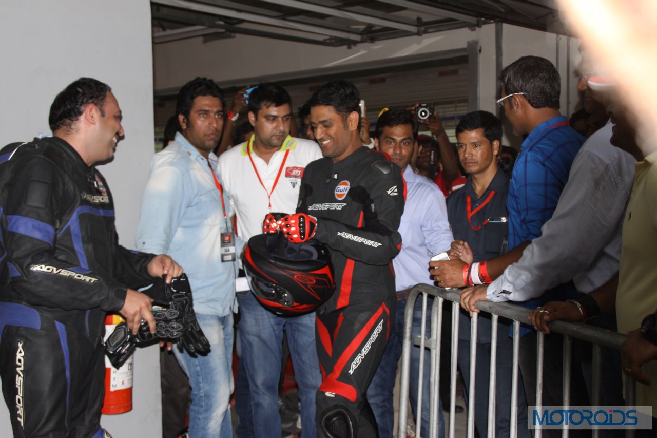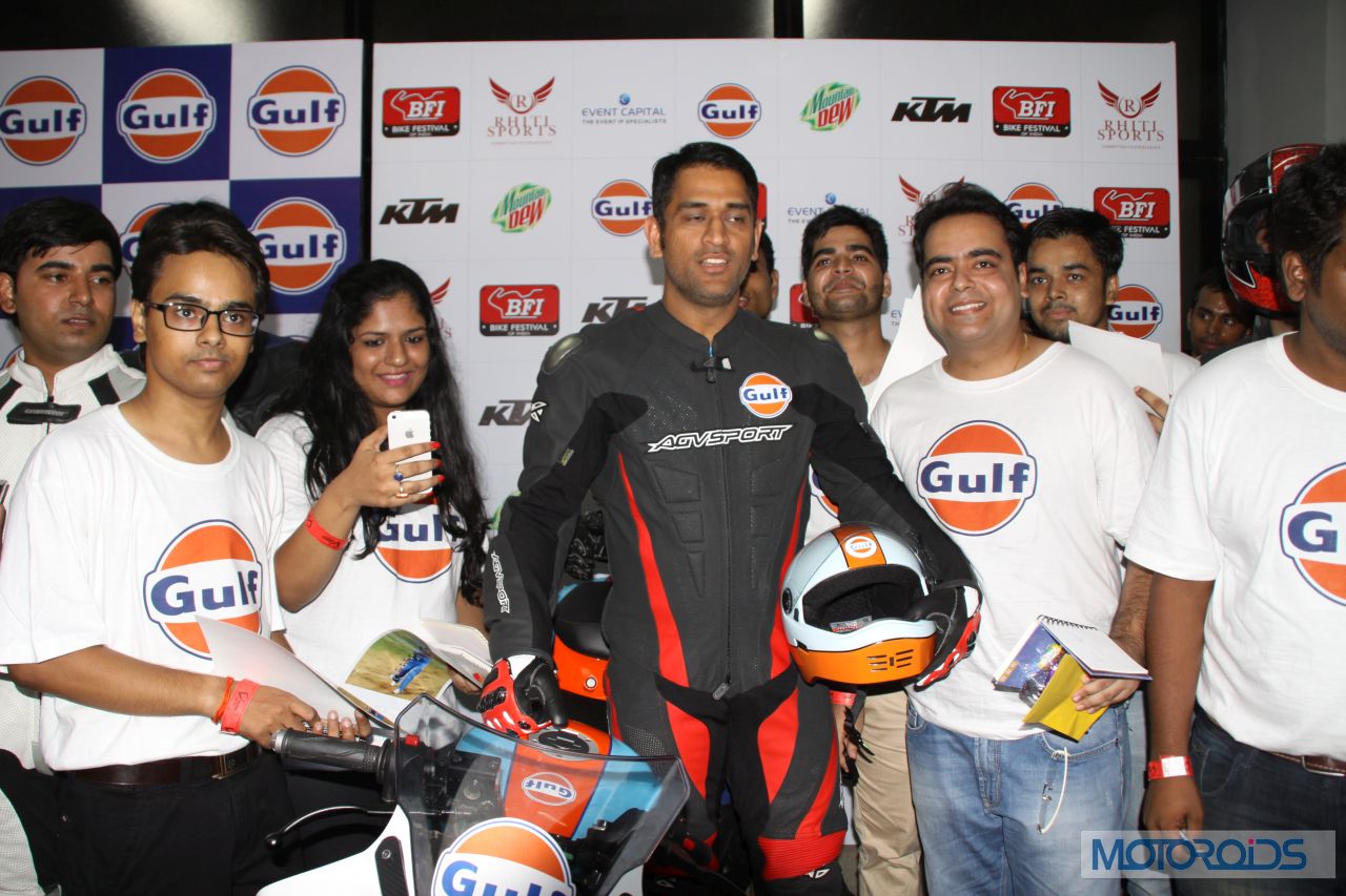 After leading the Chennai Super Kings in Bengaluru to clinch the Champions League T20 title, Dhoni was leading bikers around the Buddh International Circuit in Noida for Gulf Oil’s “Ride With Dhoni” (RWD) initative at the Bike Festival of India, again encouraging and leading young Indian talent to join professional sport. Dhoni led the ‘RWD’ 2014 winners around the Buddh International Circuit on his Gulf Oil Racing R15. The big bike boys turned into starry-eyed fans trying to get a moment with MSD.