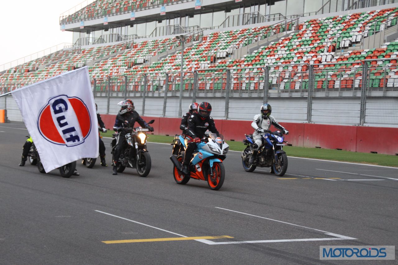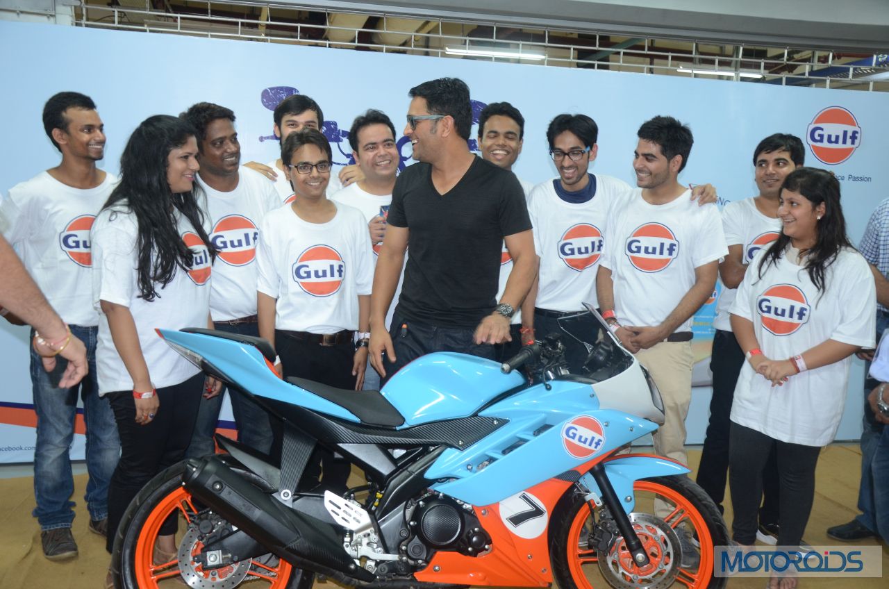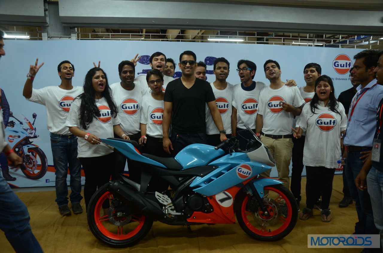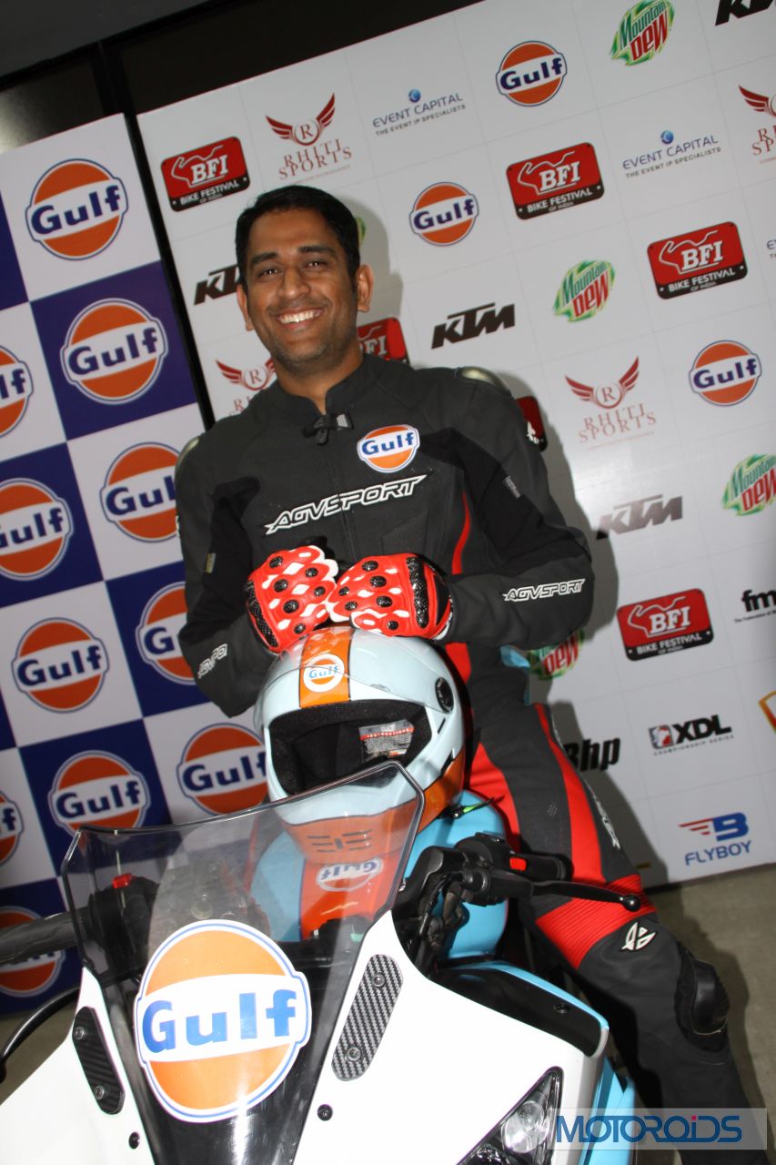 After leading the Chennai Super Kings in Bengaluru to clinch the Champions League T20 title, Dhoni was leading bikers around the Buddh International Circuit in Noida for Gulf Oil’s “Ride With Dhoni” (RWD) initative at the Bike Festival of India, again encouraging and leading young Indian talent to join professional sport. Dhoni led the ‘RWD’ 2014 winners around the Buddh International Circuit on his Gulf Oil Racing R15. The big bike boys turned into starry-eyed fans trying to get a moment with MSD.
