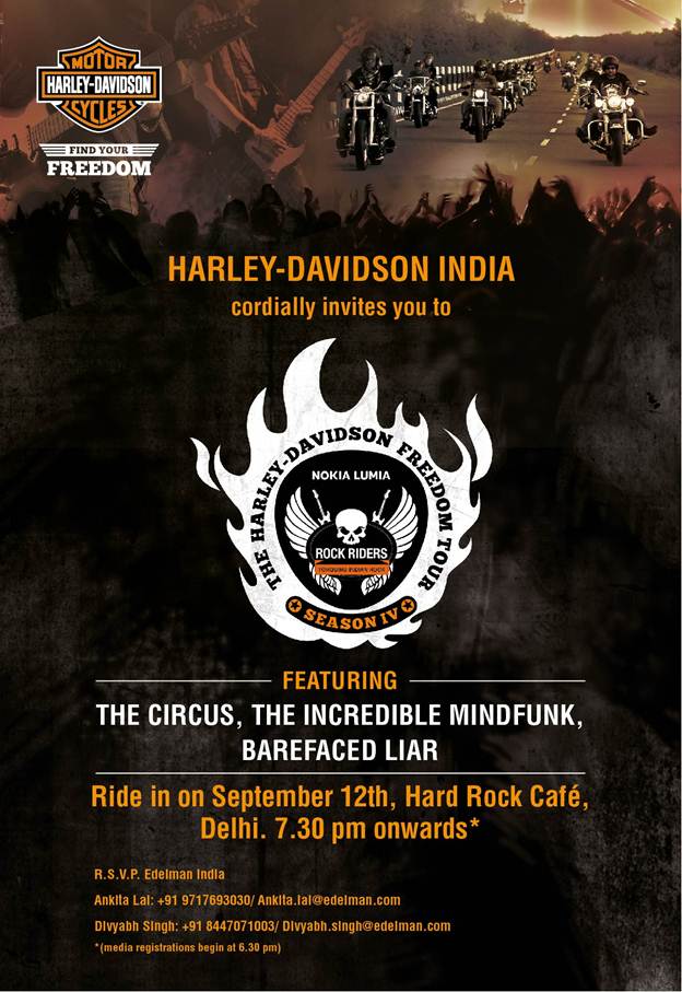 Indigenous Indian rock bands including headliners like The Lightyears Explode, Digital Suicide, The Incredible Mindfunk, The Circus will electrify their fans while each venue will feature all the unique elements of a motorcycle and music festival that only Harley can bring. Season IV will also invite Indian Rock musicians of all experience levels a chance to express their freedom and participate in “Find your Freedom” contest where the winner steals the glory by getting an opportunity to perform at World’s biggest bike festival – European Bike Week, 2014. The excitement doesn’t end here, the winning band will win the title of ”Harley-Davidson India Band of the Year” and also perform at the 16th European Bike Week 2014- Austria.