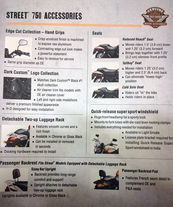 While the deliveries of the new Harley Davidson Street 750 would commence only by June this year, the bike maker has just launched a range of accessories for its new entry level motorcycle in India. The new Harley Davidson Street 750 accessories include a centre stand, tank bags, engine guard, front and rear axle nuts, polished brake rotors and custom design wheels. Also available is a Screamin’ Eagle Nightstick 2-in-1 muffler, which ensures that you are heard loud and clear, even from a distance! Also available is an Edge Cut designed muffler end cap and a Screamin’ Eagle exhaust shield kit. There is also a Harley Screamin’ Eagle performance air cleaner kit and a reduced reach handlebar. This handle bar reduces the reach by 5.1cm over the stock piece.