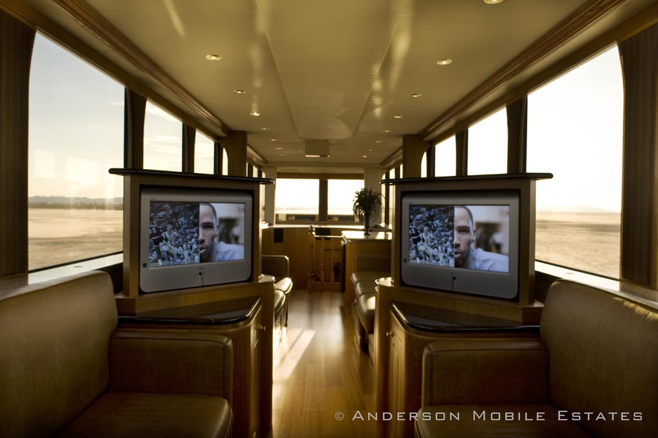 Based on a Frieghtliner based trailer, the interiors are lavishly equipped and includes a prominent master bedroom, a couple of restrooms and showers, a complete kitchen as well as a selection of leather couches and marble benches. It features up to 1,200 sq. ft. of living and working area allowing for multiple business meetings to take place, all in the utmost privacy.