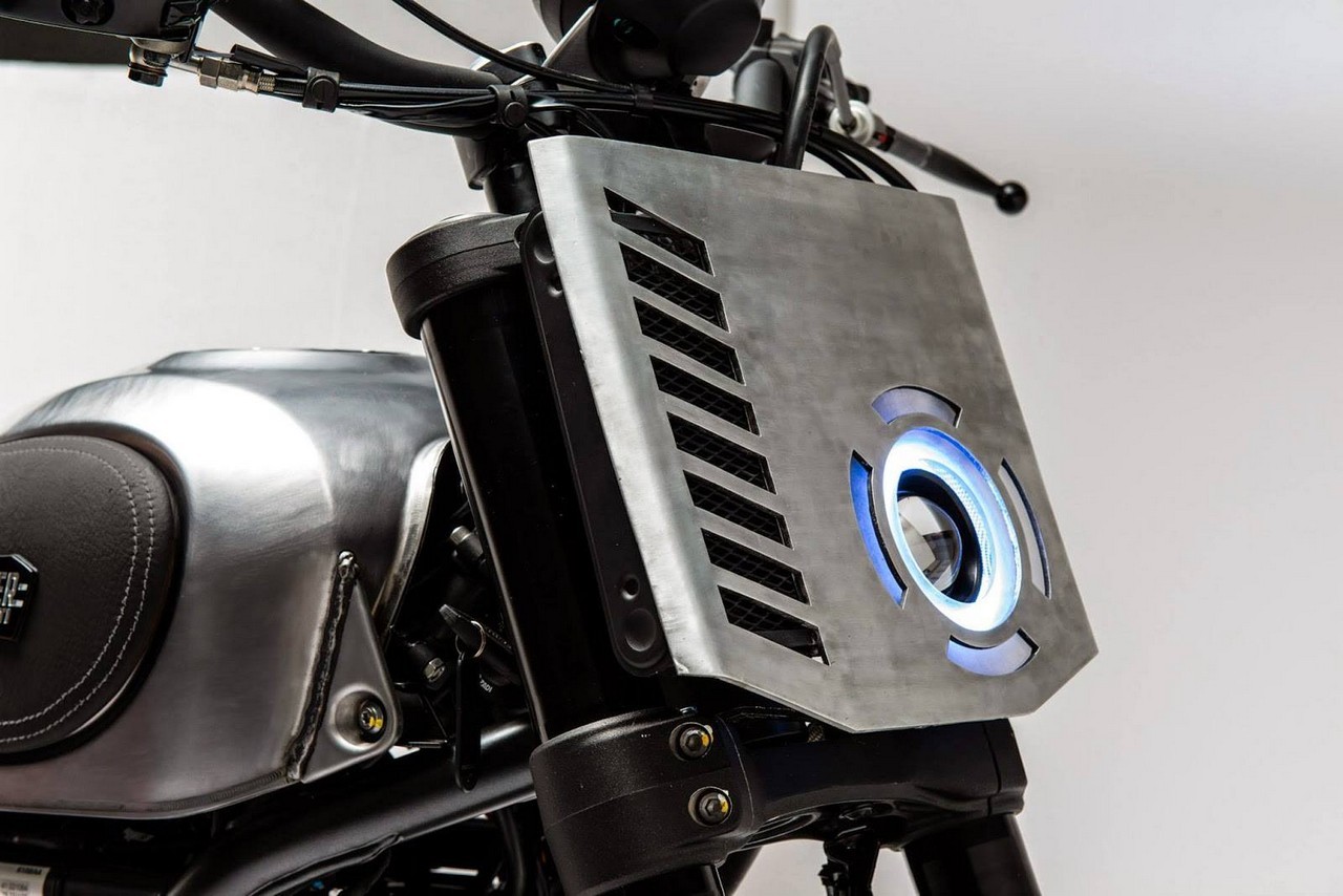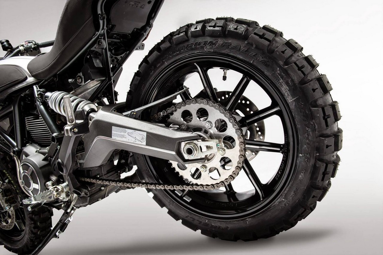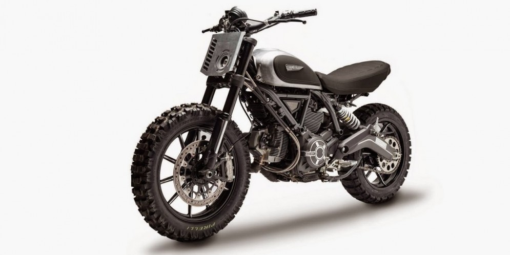Ducati Scrambler Dirt Track Concept is a go-anywhere motorcycle designed to conquer the trails and take over where the tarmac ends. The motorcycle is shod with some serious off-roading Pirelli Scorpion Rally tires with no fender, showing off its “all surface conquering” tread pattern. The round headlight has been replaced by an asymmetric unit which appears to have been borrowed from a sci-fi movie. The headlight is surrounded by a circle of light that would work as a daytime running light.