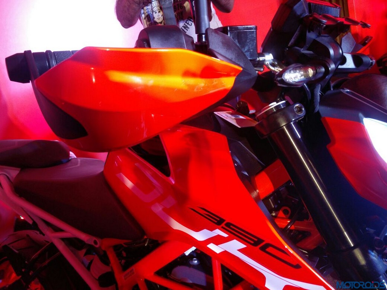 The new tank comes with sharp, beak-like tank extensions that bear the revised 390 Duke graphics.