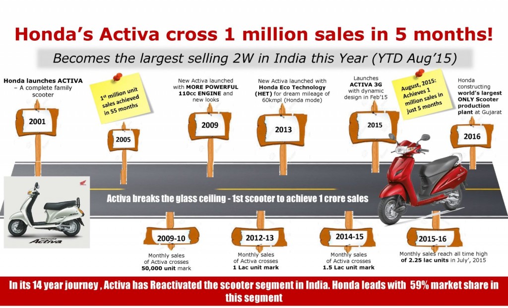 Honda Motorcycle & Scooter India (HMSI) has created a new yardstick for success as the two-wheeler maker’s much successful scooter, the Activa, has become the first two-wheeler to cross one million sales mark in five months of this fiscal (FY’2015-16). With this milestone, the Activa has now become the largest selling two-wheeler in Indian market from FY’16 till date.