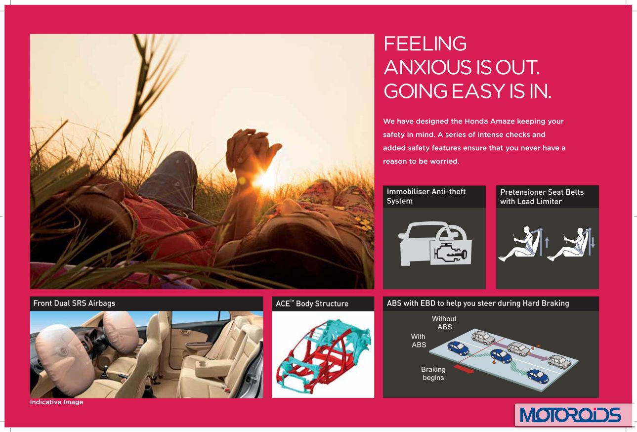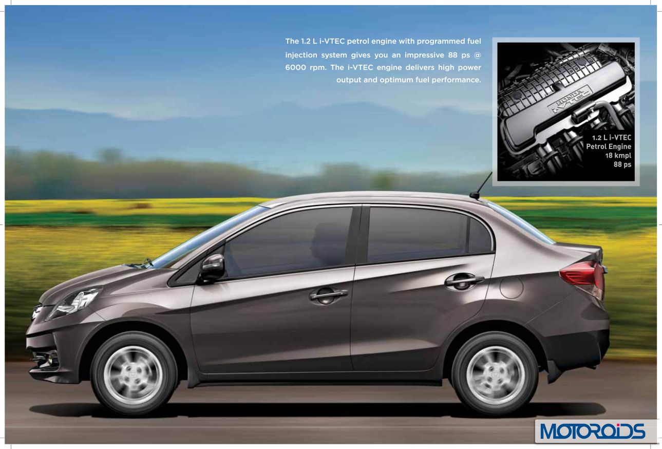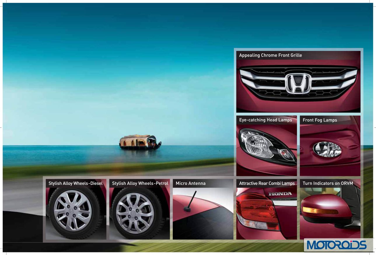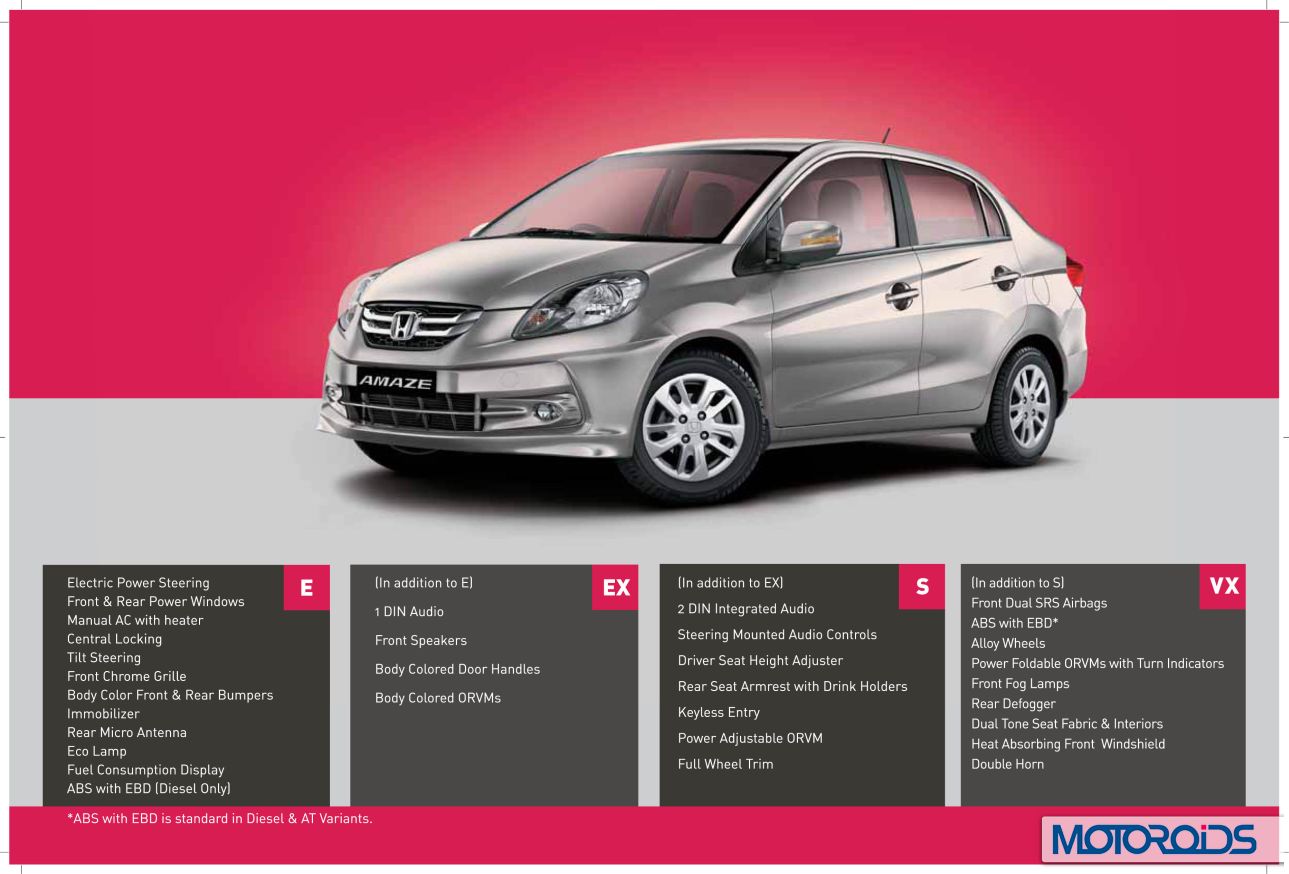 Honda Amaze’s official site is now live, and we have extracted jpeg images from the brochure to familiarize you even better with the various features and variants of the car. Here, have a look.