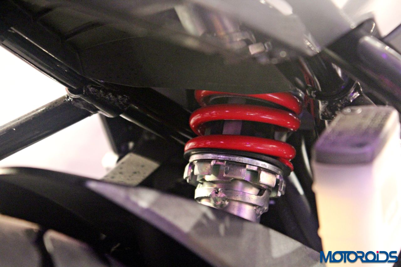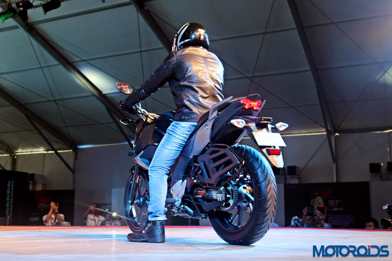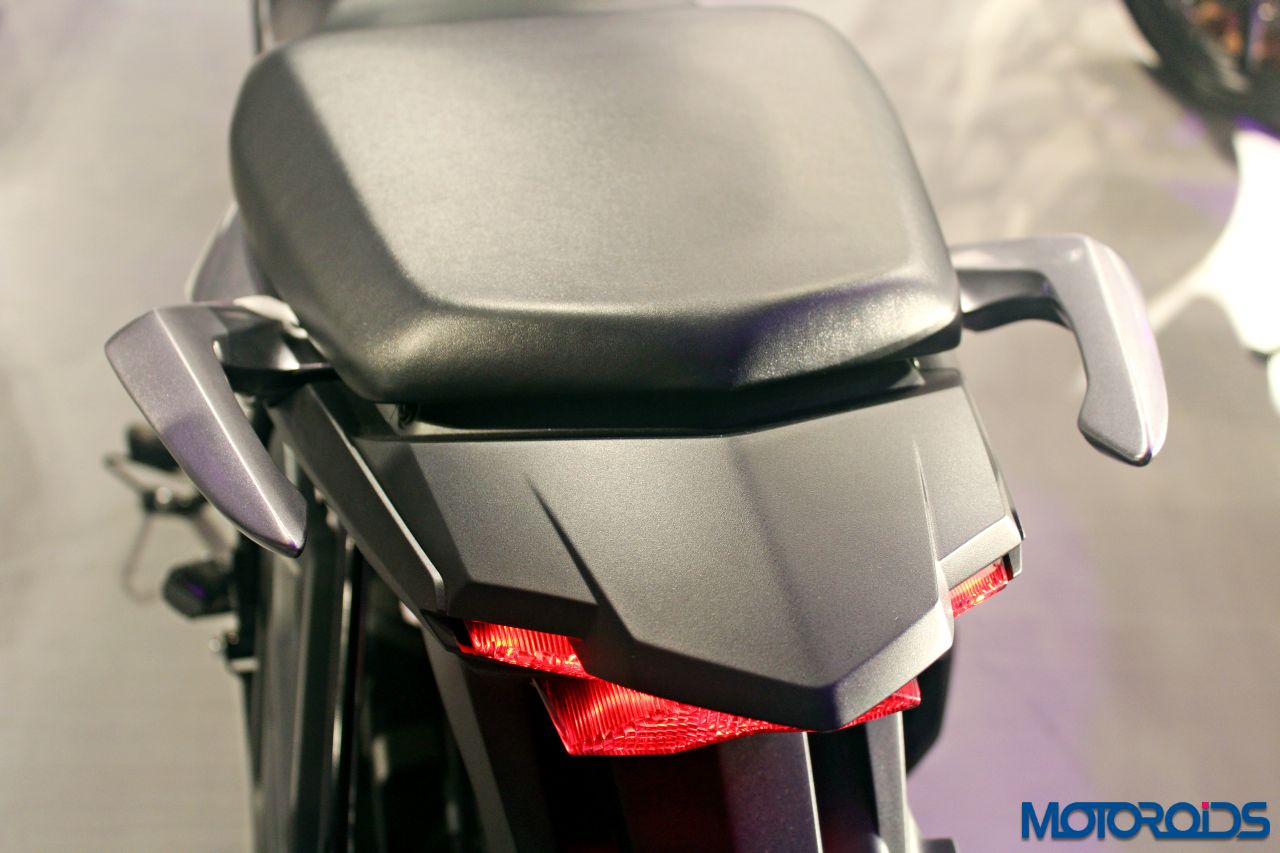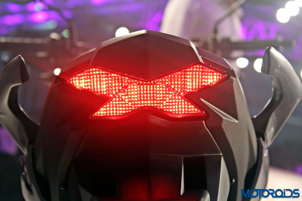 The split grab rails, along with the pointy shroud and X-shaped, LED tail lamp (below) account for a futuristic tail section.