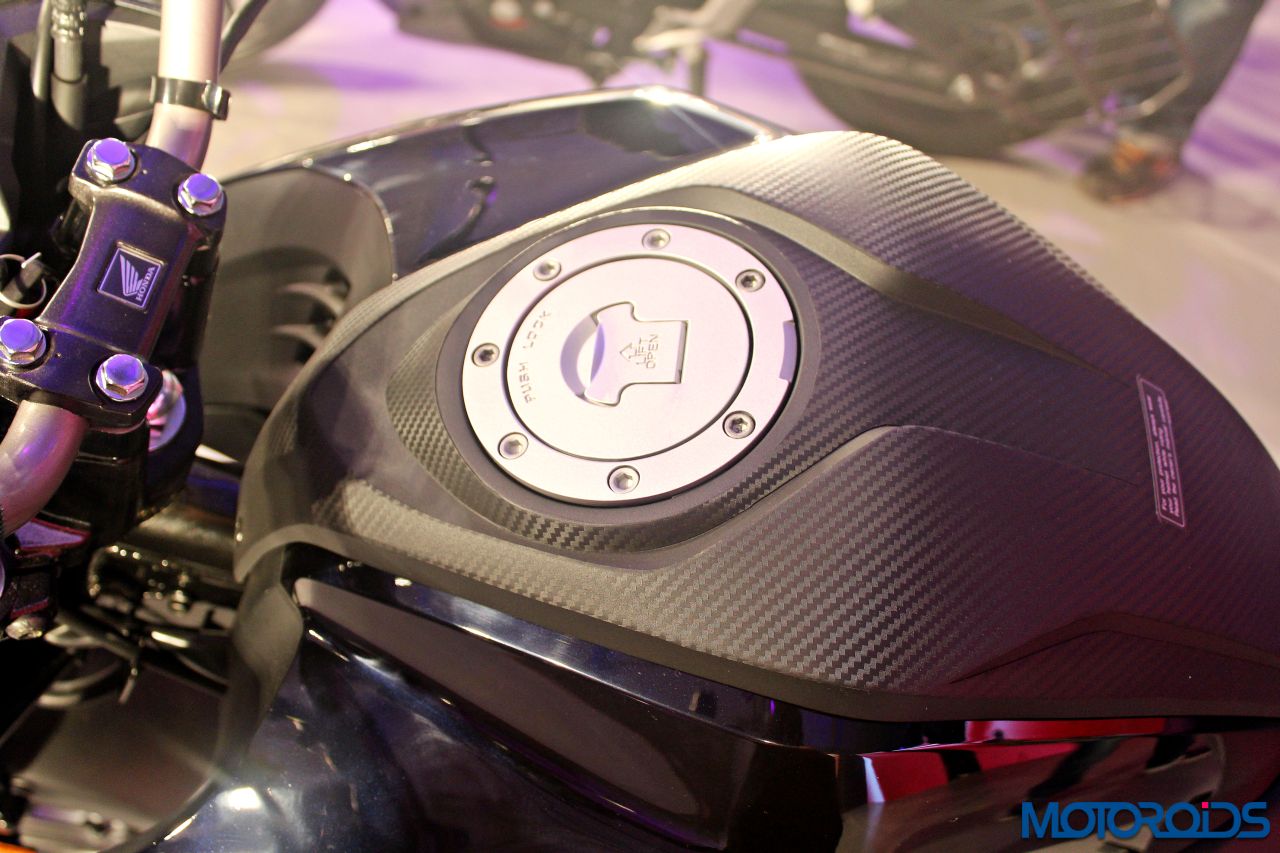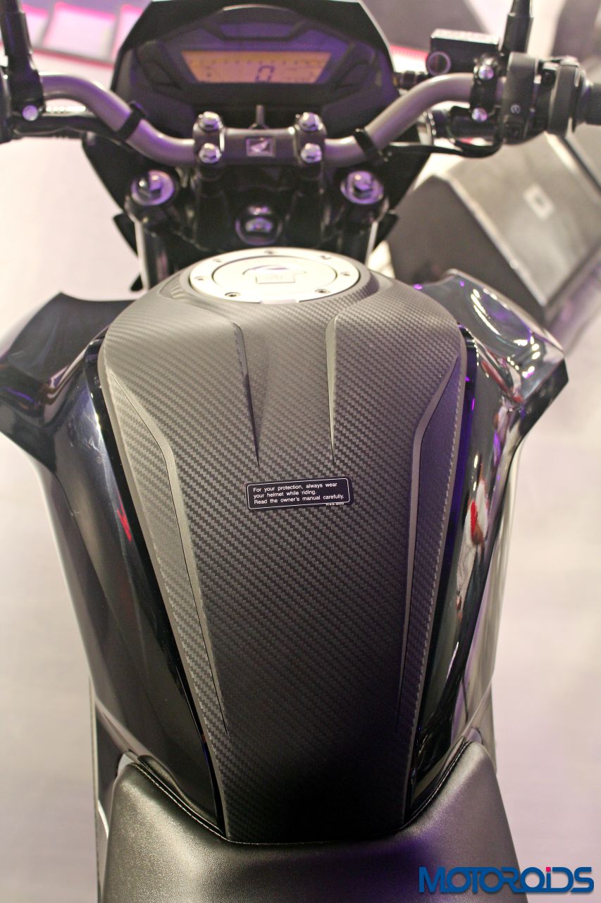 The well-contoured, full-sized tank pad gets a faux carbon fiber finish.