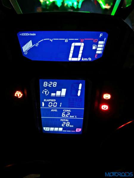 Behind the fairing is a rally style LCD instrument console that is divided into three parts. The top-most part displays the basic information like the tachometer, speedometer and fuel gauge. The lower part provides information about the gear engaged, traction control level, riding mode, odometer, two trip meters, average speed, average fuel consumption, engine coolant temperature, air temperature and a clock. The telltale indicators, including the ABS mode and parking brake indicator are positioned on either side of the display. The display offers good amount of visibility although you’d have to be sitting on the saddle to read it properly. A slightly tilted angle would’ve provided better visibility while standing up on the footpegs.