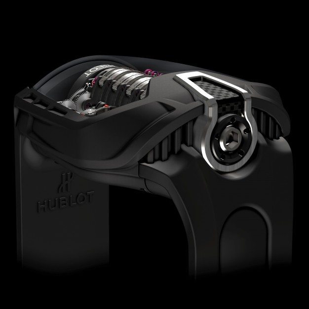 Hublot mentions that the MP-05 “LaFerrari” was developed keeping in mind the technical and design philosophy of the car. A fusion of 637 components- the most ever for Hublot, are housed in a mix of black PVD titanium and carbon fibre revealing the winding crown. The time indicators are the biggest USPs of the watch. Unlike the moving hands in a conventional watch, the time is indicated by rotating anodized black aluminium cylinders on the right. On the opposite left are cylinders indicating power reserve with numerals maximized in white SuperLuminova markings for easier reading and reinforced by anodized red aluminium bars.