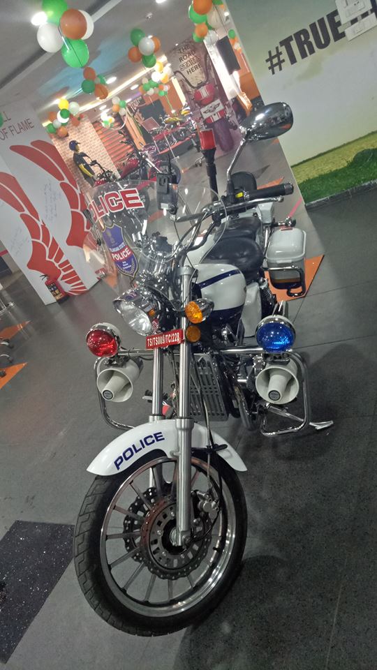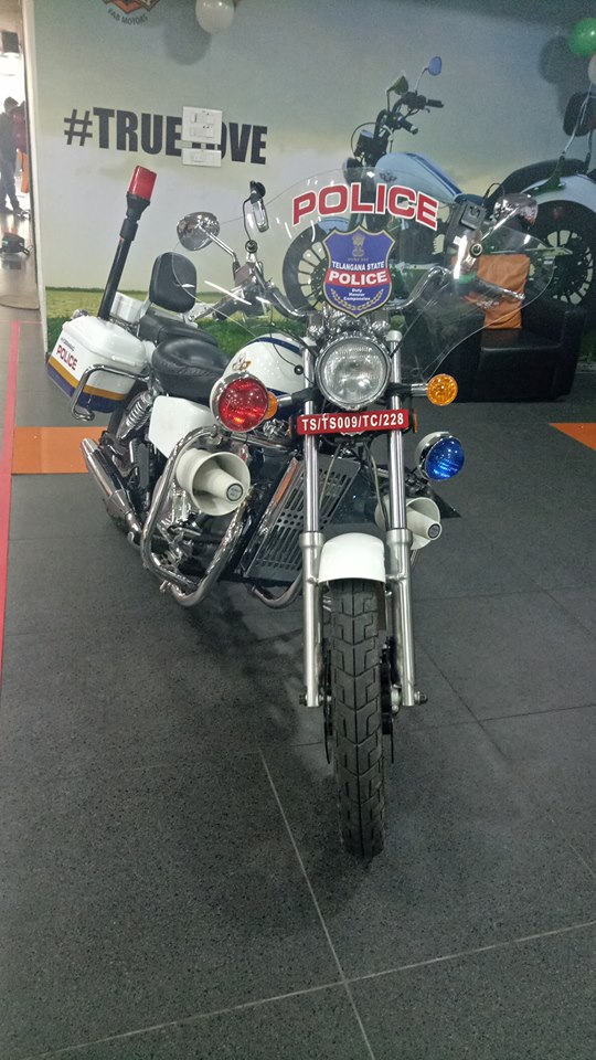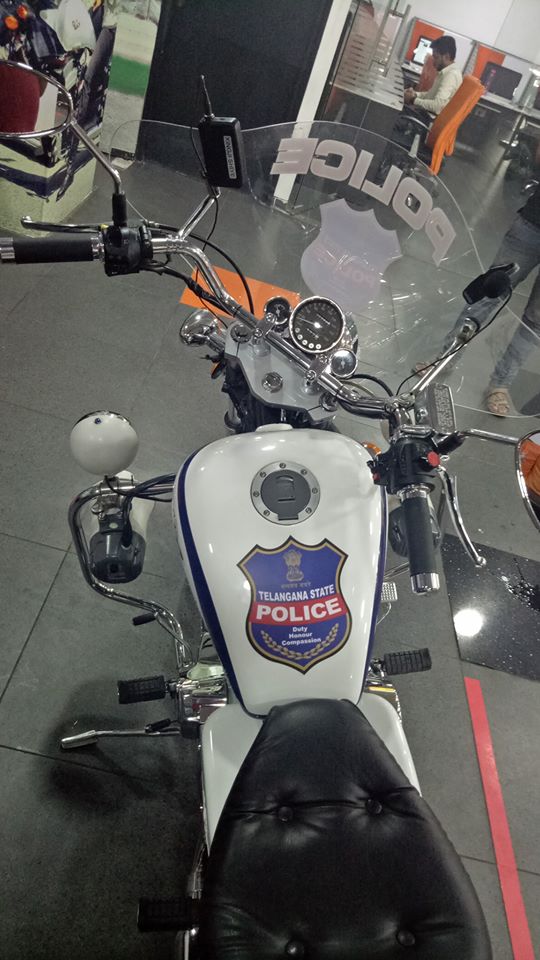 The Hyderabad Police motorcycles are based on Regal Raptor’s DD – 350E – 9B cruiser. It is powered by a 320 cc, water-cooled, fuel-injected, parallel twin-cylinder engine developing 22.8 bhp @ 8500 rpm, while maximum torque is rated at 22 Nm @ 6500 rpm.