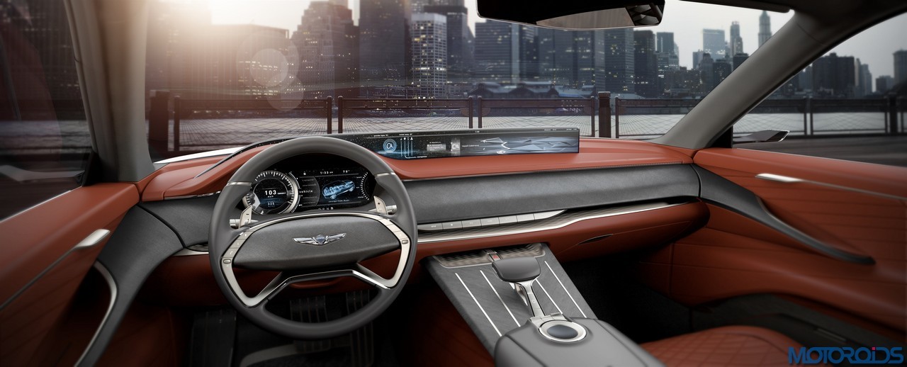 The interior of the GV80 Concept features a bridge instrument panel that stretches from door to door. A wide 22-inch curved display set in the instrument panel cascades into the driver’s cluster, which combines a classic speedometer with the flow of information from a digital display.