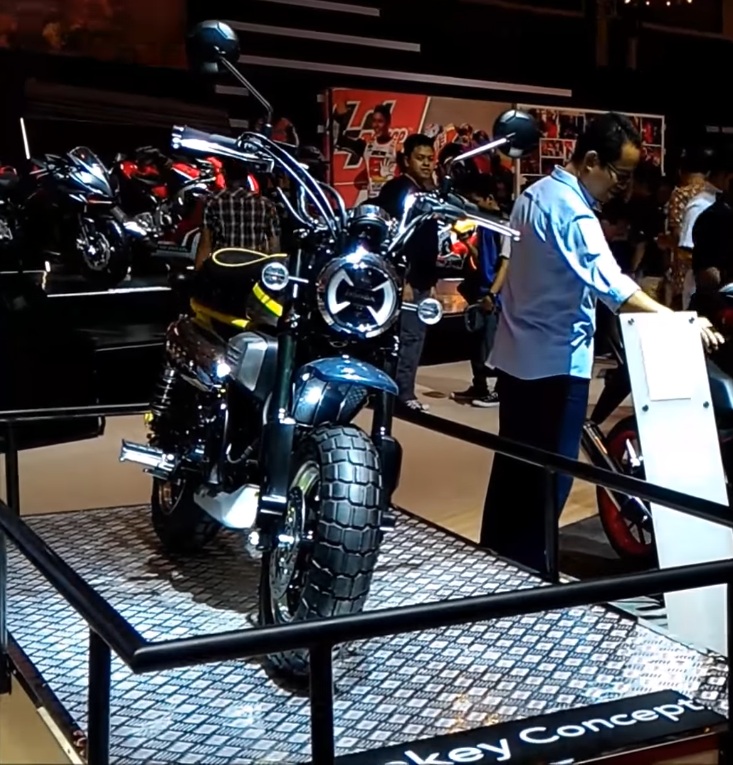 One of the many products showcased at the event was the Monkey Concept which packed the classic style of the Z50 Monkey with the frame, engine, wheels, brakes and upside down front suspension from the MSX125. However, unlike the MSX125, the Monkey Concept dons a old-school style conventional, twin-sided rear suspension and a scrambler style tall set exhaust. The box-section swingarm of the MSX125 has also been replaced by a tube swingarm. Retro-styling of the Monkey Concept is further enhanced by round headlight, tail light and blinkers.