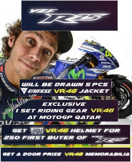 MotoGP maestro Valentino Rossi seems to have played an active role in the development of the Yamaha R25 and as the lead image of this post reveals, he has prepared a YIMM AGV helmet | VR46 edition for buyers of the upcoming YZF R25. This helmet will be given to the first 250 buyers of the upcoming motorcycle in Indonesia. Basically, anyone who has been quick enough to get the bike booked is entitled to get this lid. It is being said that currently, 500 units of the R25 are available for bookings in Indonesia. Also, the first buyer of the Yamaha YZF R25 gets a a set of Rossi MotoGP Qatar riding gear .And if you thought the set of prizes end here, check again. Yamaha Indonesia is also offering 5 units of Dainese riding jacket to 5 winners!