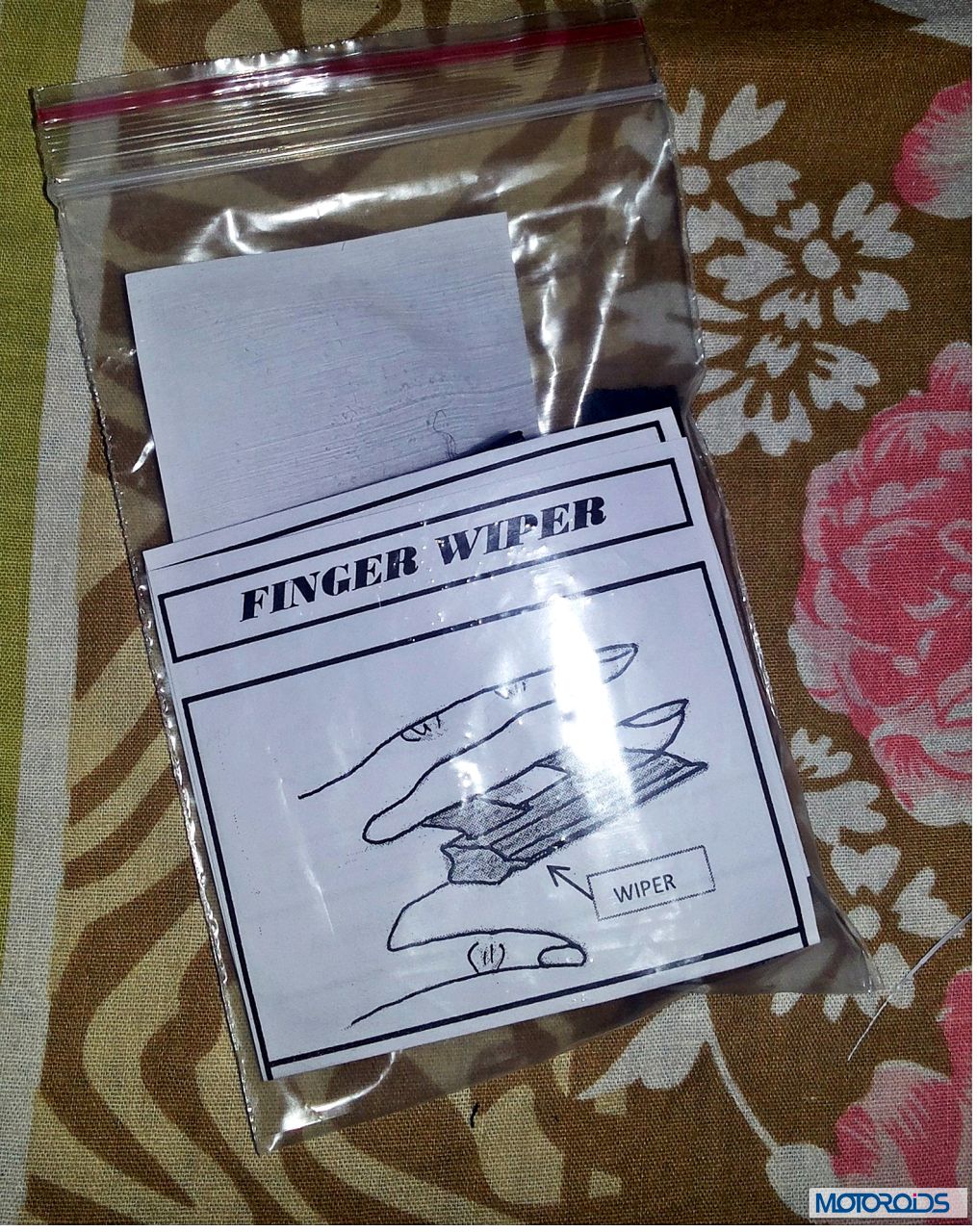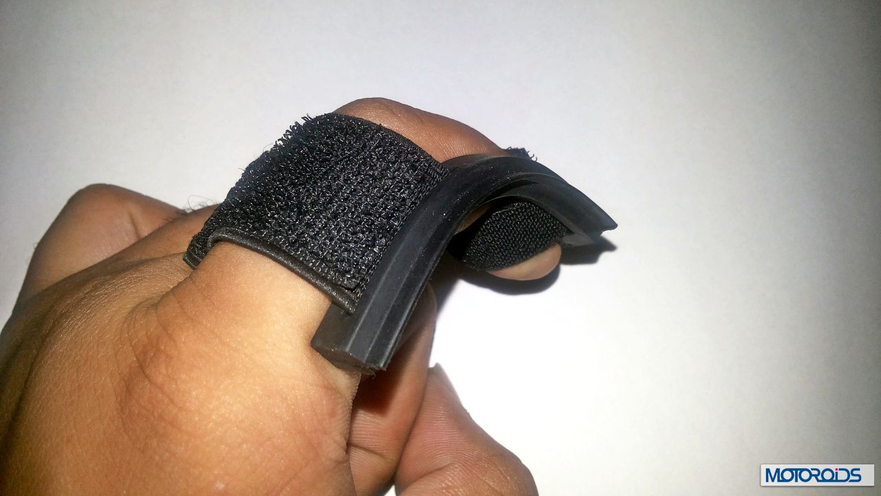 Mount it on left hand index finger no matter whether you are left handed or right handed as it is easy to leave the clutch than accelerator. Mount it in such a way that its wiping edge is parallel to ground. While using it, slightly bend your finger, wipe the water and enjoy your ride even if it’s raining.