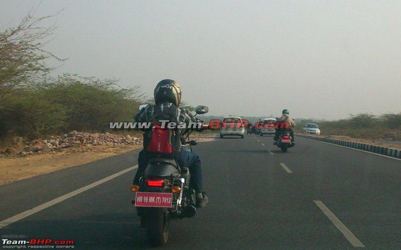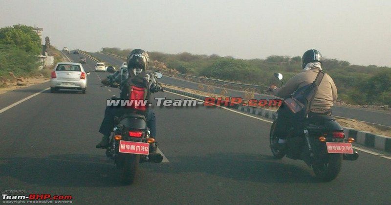 Thanks to KpZen- a Team-bhp member from Haryana, while on his way to work spotted two cruiser test mules on the highway. The design does manage to rattle our guesses- people might assume it for the soon to be launched Hyosung GV250 Aquila- but looking at the size of the cylinders, it certainly doesn’t look like a 250 to us. Neither does the design resemble or come anywhere close to the likes of Yamaha, Honda, Suzuki or a Kawasaki.