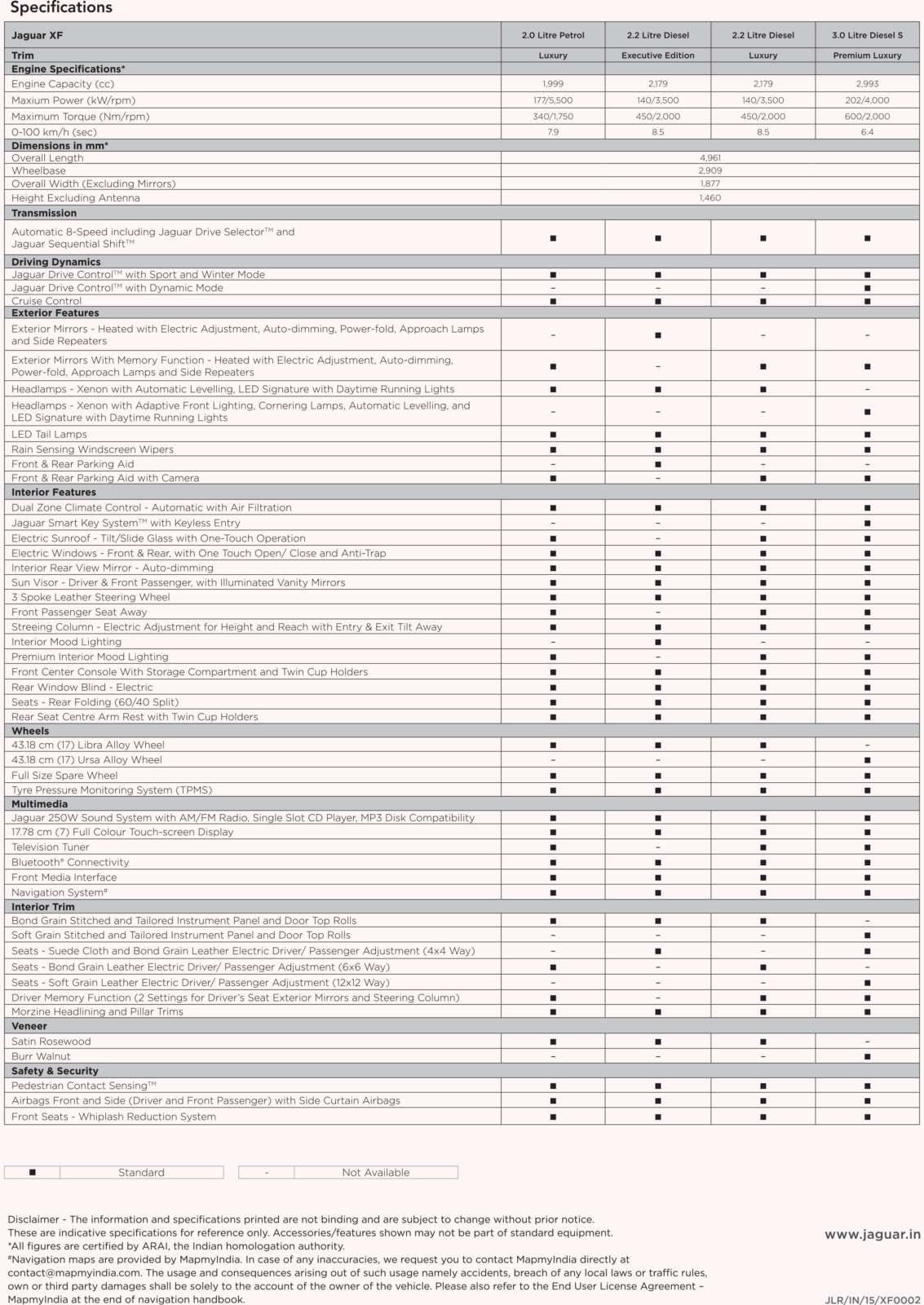 The Executive Edition of Jaguar XF is powered by the same 2.2L Diesel engine with a power output of 140 kW@3500 rpm and offers an array of features which include 8 Speed automatic Transmission, Navigation system, Full Size Spare Wheel, Full Colour Touch Screen and Jaguar Smart Key system with Keyless start. It also includes Interior Mood Lighting, Electronic Front Seats and Power-fold Exterior mirrors.