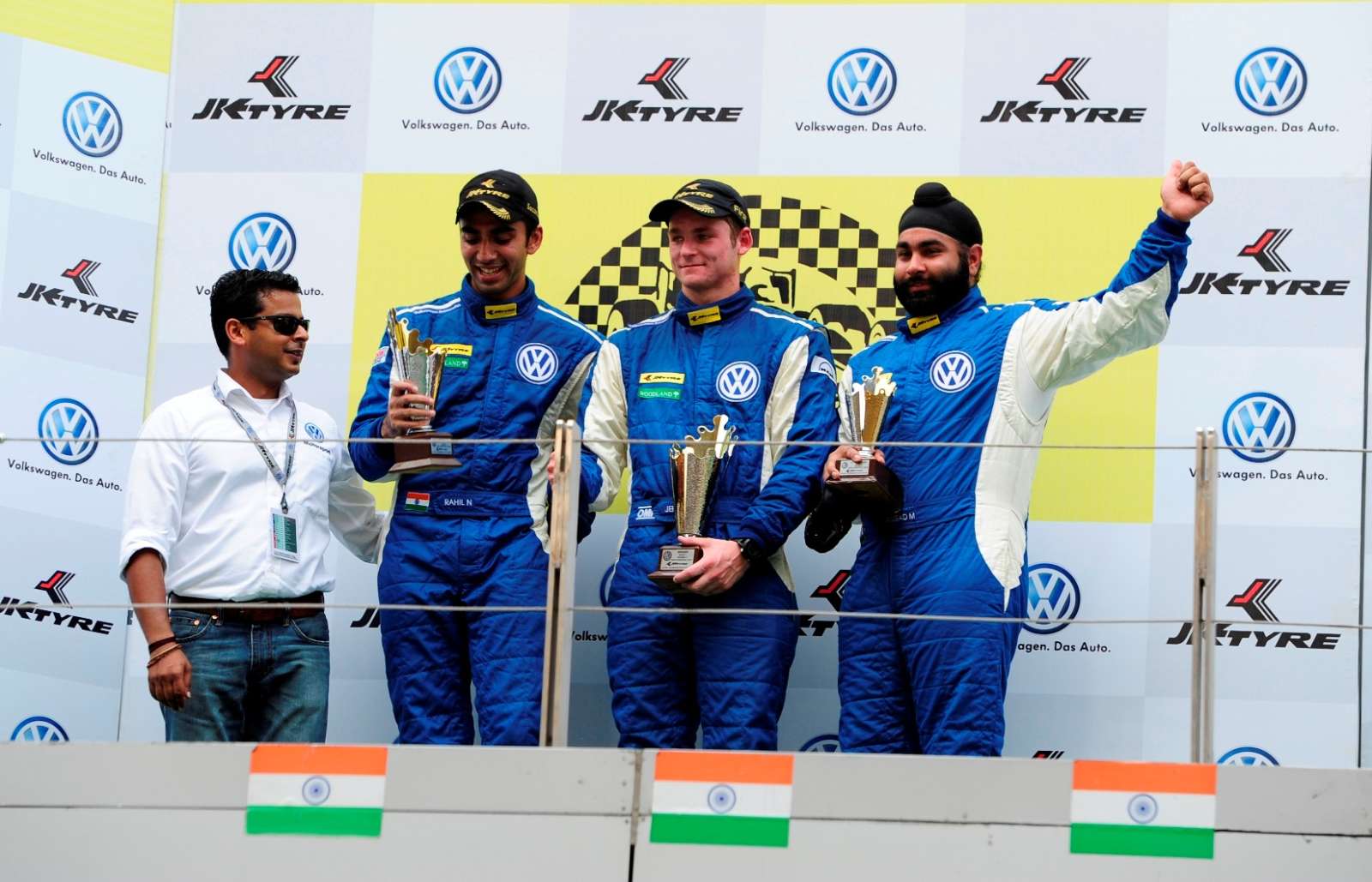 As soon as the race started, Jeffrey took off and never looked back. His racing line was perfect and with no competition he won easily. Rahil had an action-packed lap 1 when he was overtaken and lost 2 spots. He drove hard and within few seconds he reclaimed his 2ndposition and this time he maintained it till the end. Angad Singh Matharoo had his best race of the season. He had a good qualifying and started the race at the 4th position on the grid. His 2 years of Polo R Cup experience showed when he was able to move up to the 3rd spot during the race and successfully ward off competition that was vying for his place throughout the race. Surprisingly, in the past 4 races he had finished 4th, 3 times and only this time he made it to the podium.