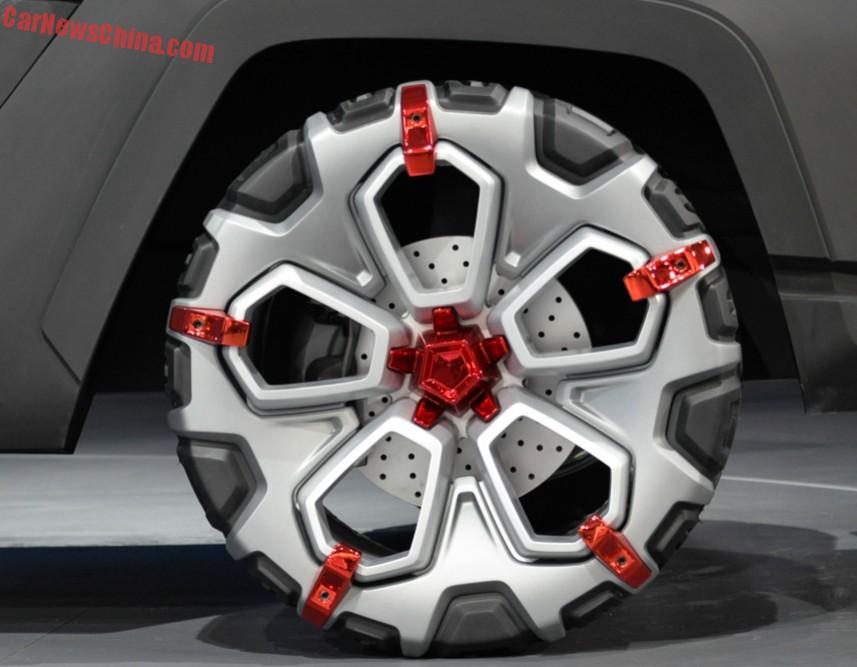 This futuristic concept showcased at this years Shanghai Motor Show receives in dual colours paint job in two shades of grey. A single piece cladding covers the front of the vehicles and runs over the wheel arches and sides to give this concept SUV a rugged and muscular look. The LED headlight extends to the sides, well above the front wheel arches. A JMC logo sits between the headlights. But the most interesting and attention grabbing part of the Yuhu concept SUV are the wheels. The alloy crosses over to the wheels which is a bit of surprise. Ventilated disc brakes are visible through the cavities.