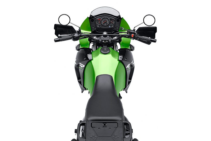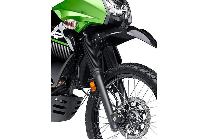 Along with new graphics, updates to the motorcycle include new springs for the front and rear suspension with rebound damping to provide a more stable platform. The suspension update is claimed to make a big difference to the KLR’s handling and feel. The front dive stands reduced during braking on pavement and gives a more real dirt-bike feel during off-roading.