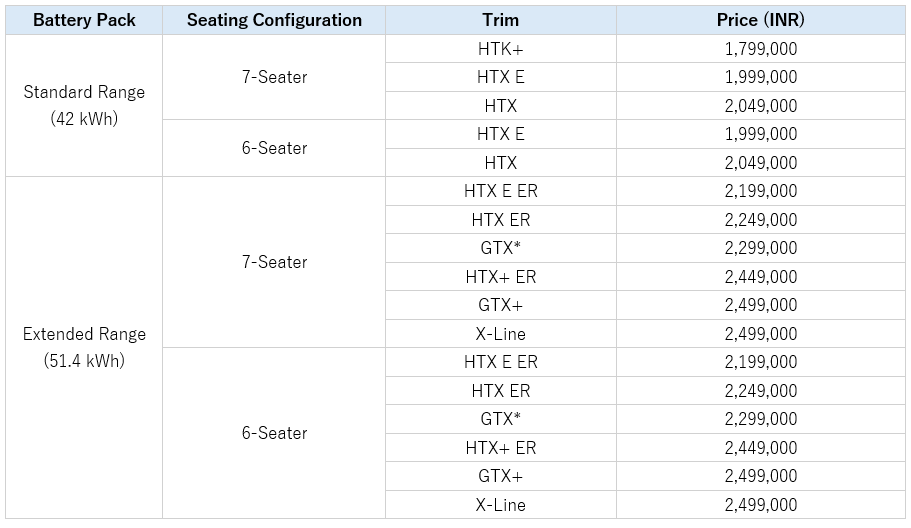 Prices start from Rs 17.99 lakh for the standard range and go up to Rs 24.99 lakh for the top variants. Both battery options are available with 6 and 7 seater layouts across trims like HTK+, HTX, GTX+ and X Line.