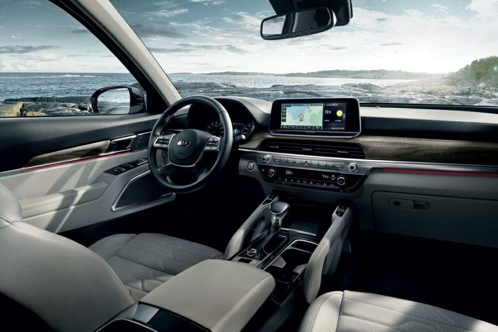 - Regardless of trim level, the Telluride is equipped with various luxury-oriented features (standard) that are otherwise optional in some of its competitors, such as “Sofino” (leatherette)-trimmed or leather-trimmed seating surfaces, a touchscreen infotainment system with Apple CarPlay and Android Auto smartphone integration, SiriusXM Satellite Radio, and Kia’s suite of “Drivewise” advanced driver assistance technologies