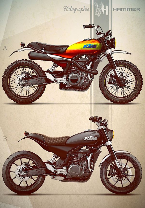 Holographic Hammer, a Paris based design firm has transformed the last identifiable atom of the KTM 390 Duke as we know it into awesomeness beyond compare. The pictures here would likely make you think of the Ducati Scramblers at first, but they actually are a theoretically doable mod-job on the rather ubiquitous naked Duke. Over and above the core modification, the designers have presented their idea in two different liveries / concepts.
