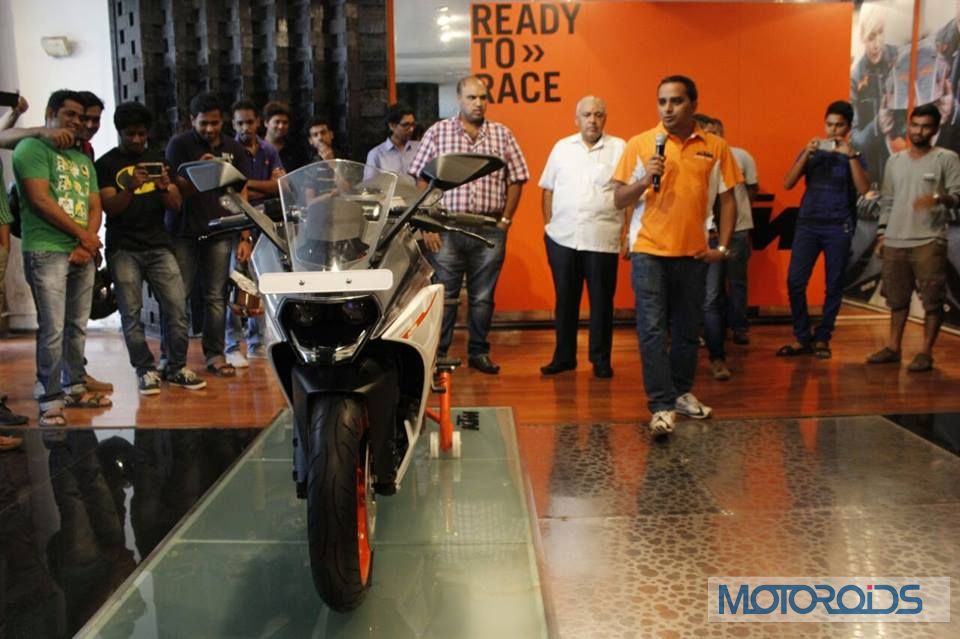KTM officially unveiled the highly anticipated RC series at an event in Pune on September 9, 2014. The dealers have already started receiving the motorcycle. KTM Navi Mumbai also held a private unveiling ceremony of the KTM RC390 at its showroom where it invited customers to have a clear look at the motorcycle and make bookings for the same. Showroom owner Mr Sachin Vijan and his father Mr Ramesh Vijan unveiled the RC390 in presence of motorcycling enthusiasts. Area service manager, Mayank Bhatt, explained all the features of the RC390 to the audience at the event. The KTM RC390 is priced at Rs 2.32 lakh (OTR) in Navi Mumbai.