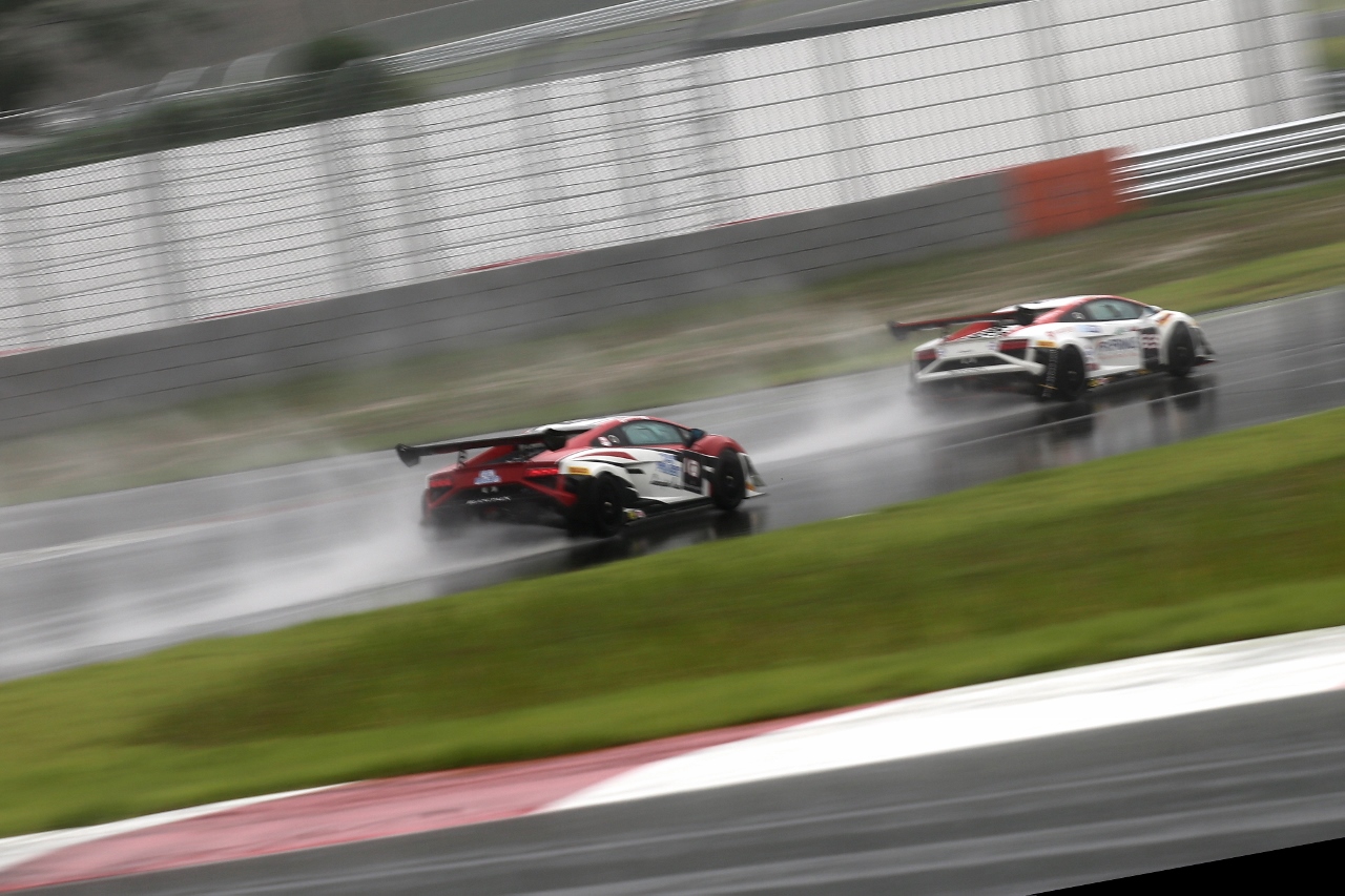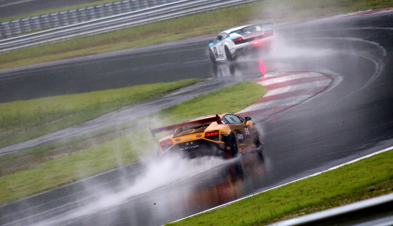 The early afternoon on Saturday saw new standards of driving at this young venue, where heavy rain befell the Super Trofeo Asia Series for the first time this season and brought contestants a new dynamic in the 2 qualifying rounds. Clenching pole position with the fastest qualifying times, Zheng Ting and Steven Lin (#66) from China grasped the limelight at this early stage of the race to instantly put themselves ahead of the game.