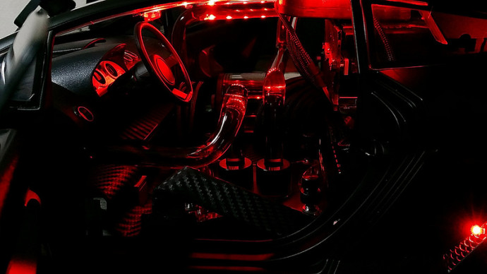Also the interiors of the car have been souped with red LED lights that makes the black Gallardo CPU case look even more better in dark. Von has retained the headlights of the Gallardo that lights up when the CPU is powered on. Now only if it could also roar up like an actual Lamborghini when switched- rather these sounds could very much be used for start up and shutting down of the system.