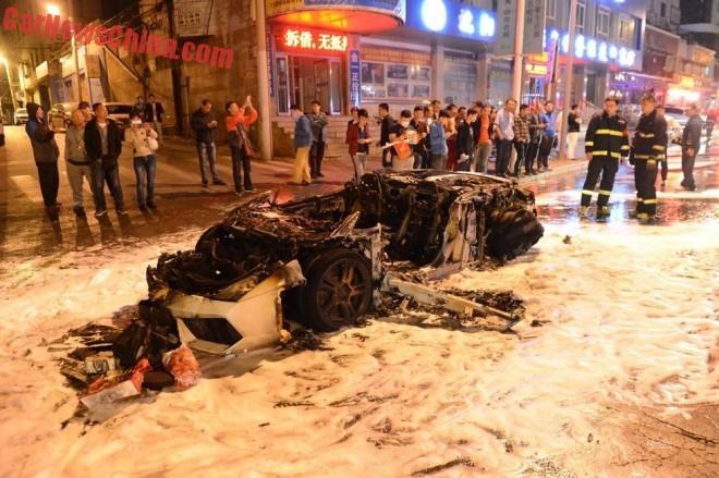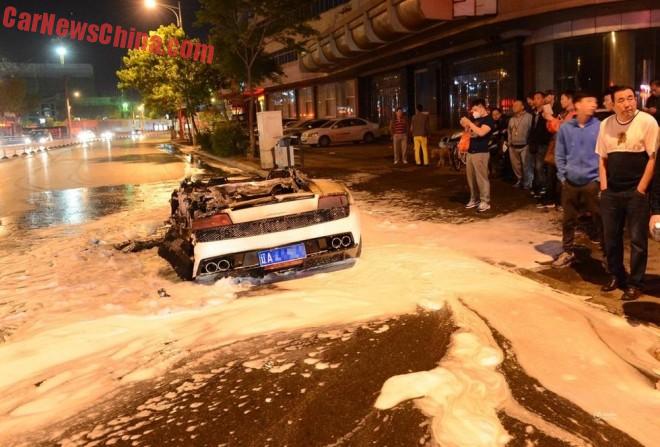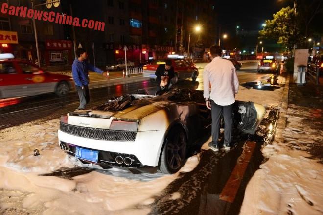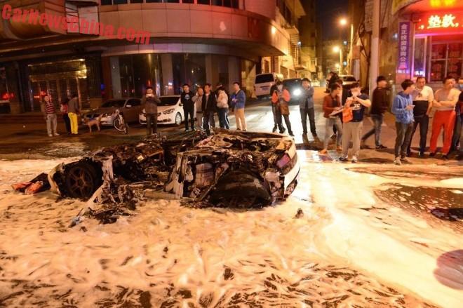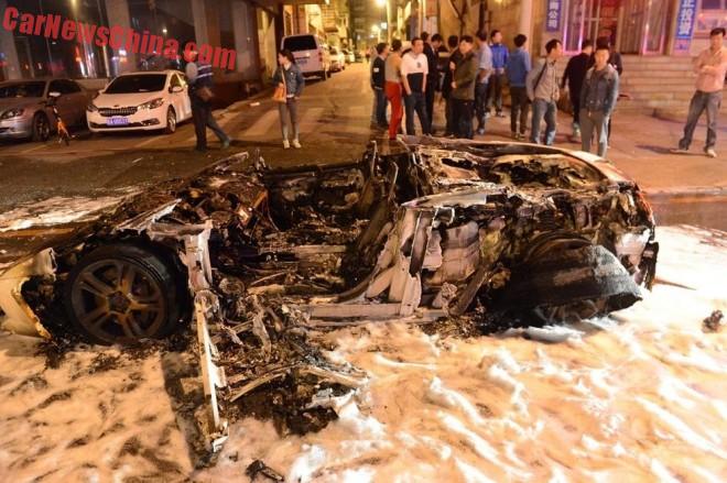 The incident took place in the early hours of May 6th, in the city of Shenyang, China. Fortunately, the driver, who is the younger brother of the actual owner, managed to escape in time and only sustained minor injuries. Seen engulfed in foam after fire trucks killed the flames, not much is left of the supercar, except for a few bits which the owner can possibly use as fancy furniture in his house. Another sad day for a super car. Has to be something about China though, it was only a couple weeks ago when a yellow Ferrari immolated itself on a busy street.