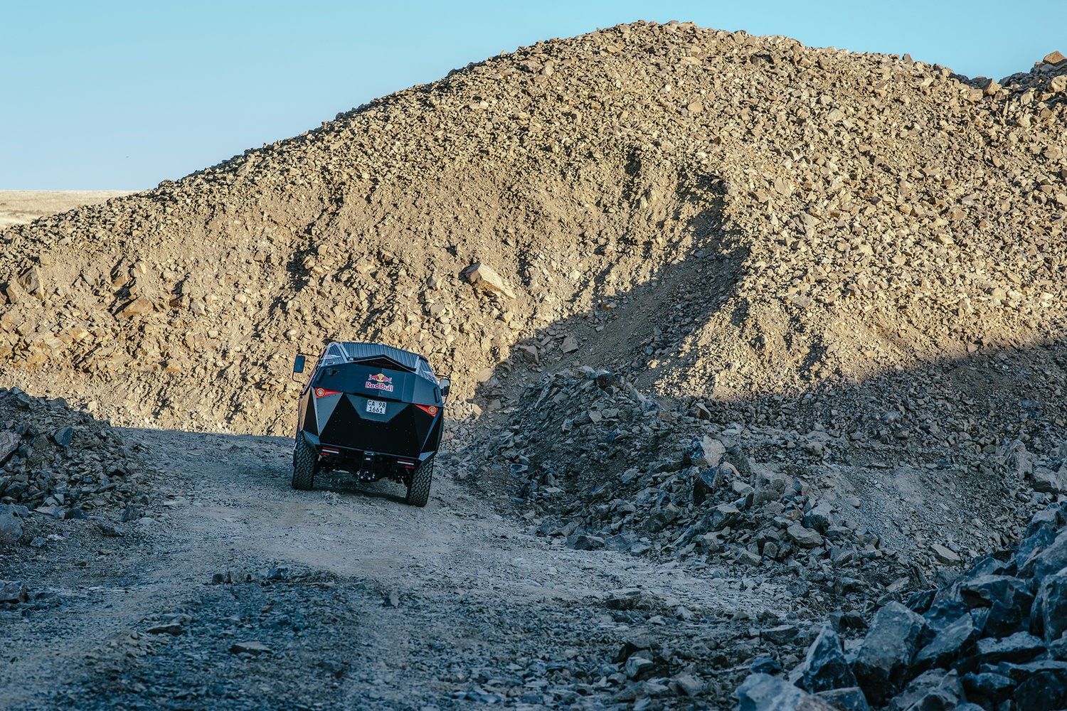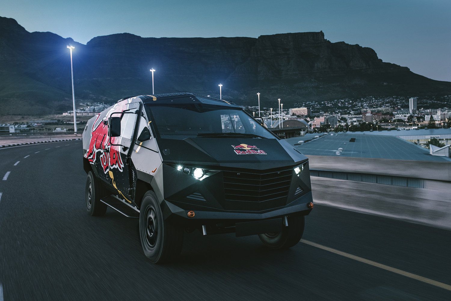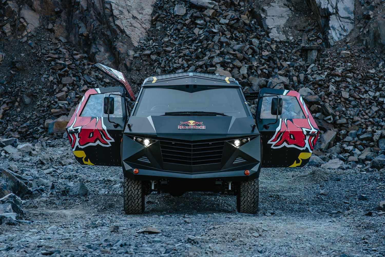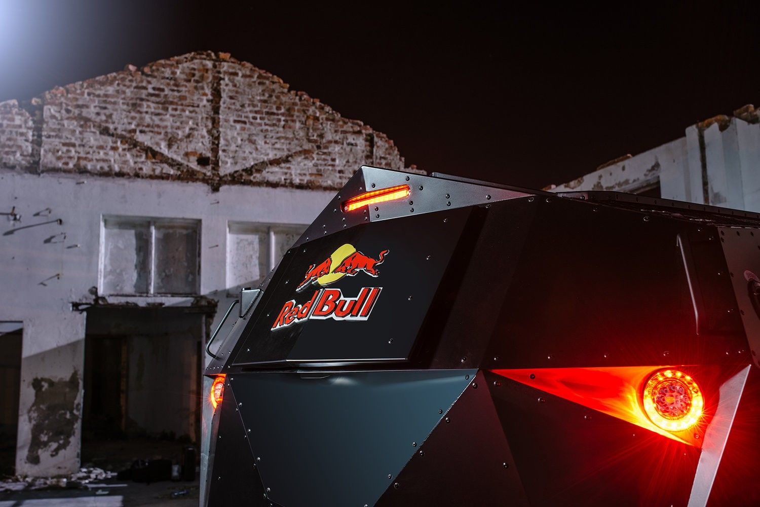 One look at the party machine and all we could think was how outlandish and appealing this Australian creation appears. The triangular body panels and the matte-black paint job may remind of a stealth fighter war machine but it is anything by conspicuous. This is one huge party machine to say the least. Most part of the front fascia is held by a massive grille. Projector headlights perform the illumination task but we wonder if they double-up as party lights. The trademark Red-Bull brand logo and icon sits on the bonnet while the logo of the charging red bull, sans the brand name occupies the side of the vehicle.