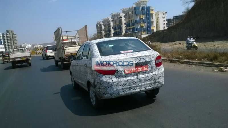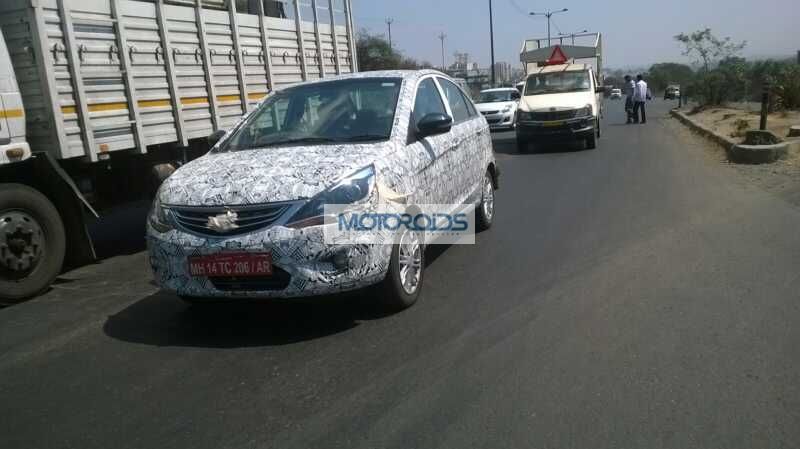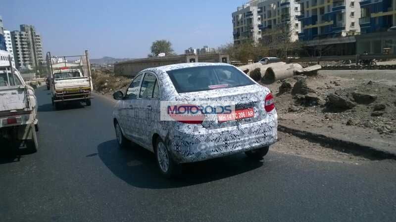 Today morning, our friend Omkar Kulkarni sent us a new set of Tata Zest spy images, which show a highly camouflaged Zest test mule being tested on the outskirts of Pune. While enough is already known about the upcoming car’s aesthetics, these new spy images reveal that Tata Motors could have bestowed the Zest with a new front fascia! True, the heavy camouflage prevents us from having a good look at the front-end styling but it is very evident that the car has been given a new front grille, which has twin chrome slats running across it, rather than the honeycomb mesh design of the show car’s grille.