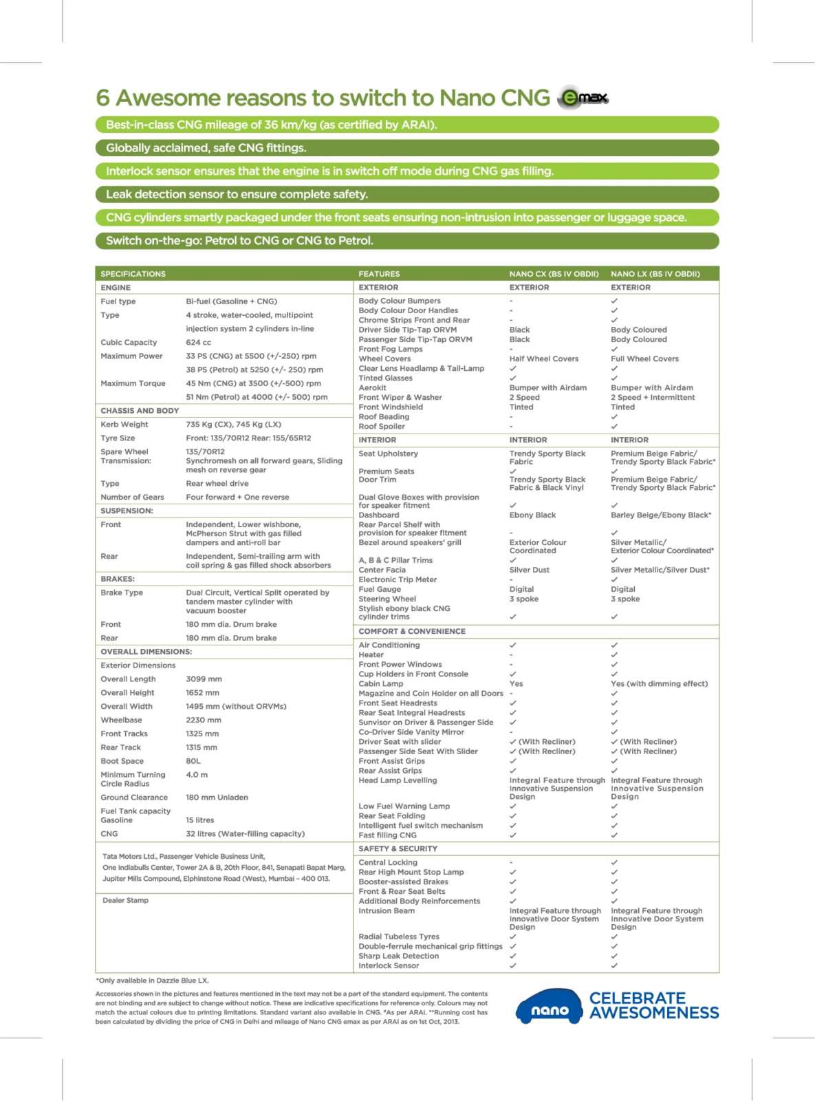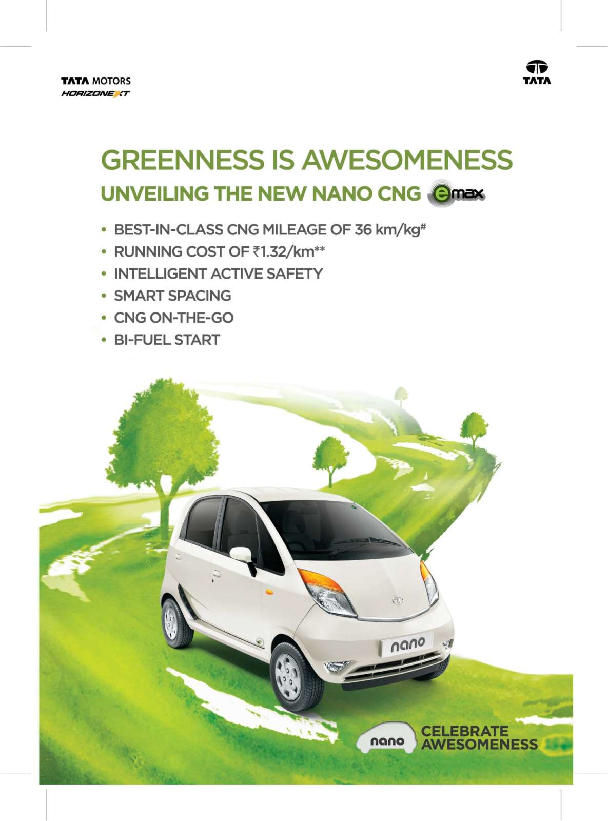 The Tata Nano CNG emax can run on both CNG and Petrol. The car has the lowest carbon footprint of 75.6 g/km* and is the most fuel efficient car in India with an ARAI tested fuel efficiency of 36 km/kg for the base model. The Tata Nano CNG emax will now be available across CNG markets like Delhi, Gujarat, parts of Maharashtra and Lucknow.