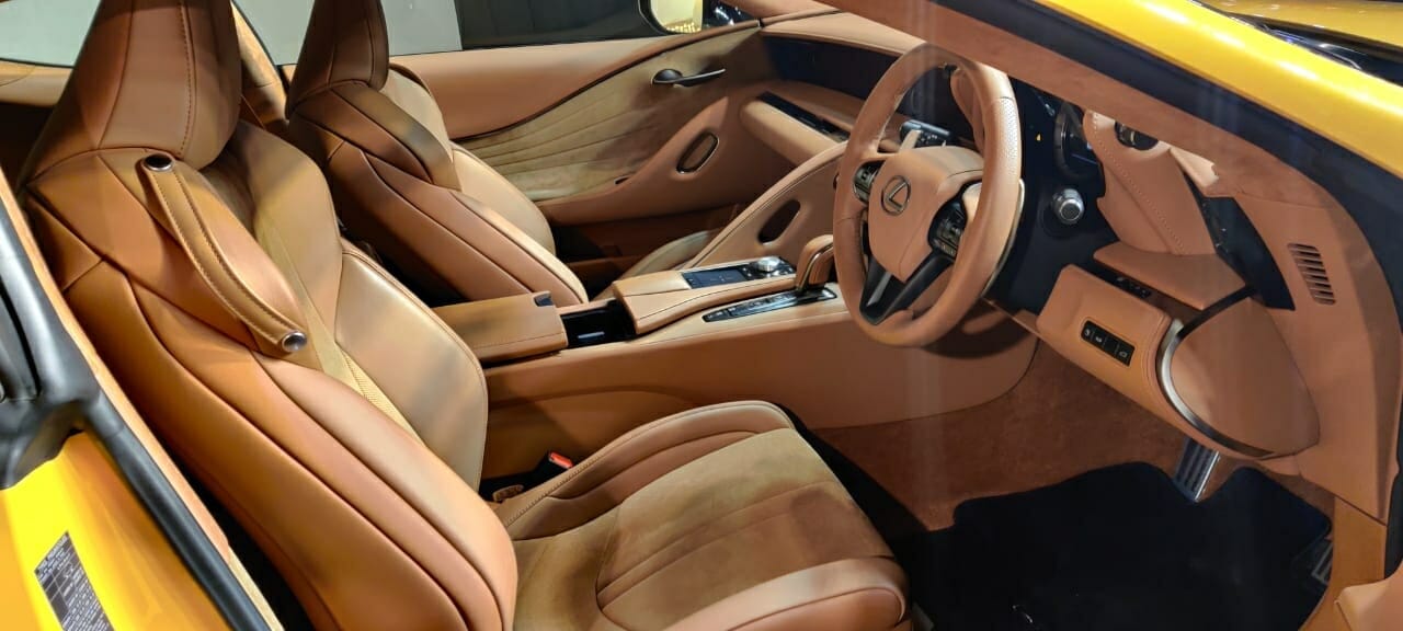 Inside, the cabin is full of craftsmanship and features a large infotainment system in the centre which is Apple CarPlay and Alexa compliant. Audio is routed through a 12-speaker system and an LFA-inspired G-meter is displayed on the 8-inch monitor behind the wheel. Everything is surrounded in the richest hide, although space at the back won’t rival a proper sedan’s rear seat. The 10-speed gearbox’s intelligence can be intervened through magnesium paddles behind the wheel and on-board safety systems include a rear camera with guidelines, triple-beam LED headlights, a blind spot monitoring system, optional park assist and 10 airbags.