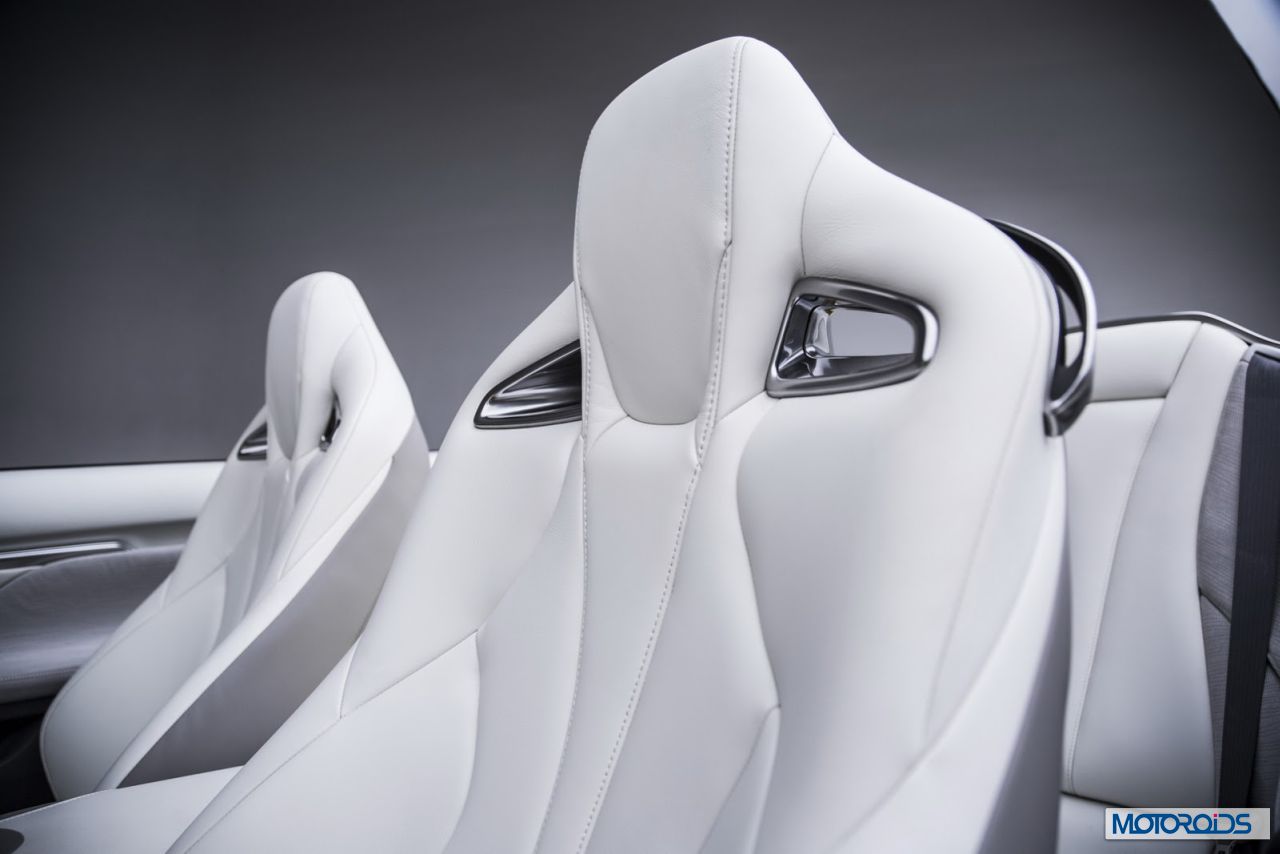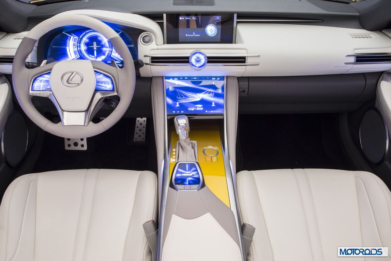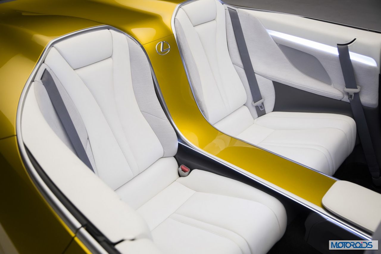 The cabin is decidedly next-gen with white and grey being the only two hues used by the designers at Lexus to create a unique ambience. All the screens are white and blue backlit, endowing the LF-C2’s interior a light, amenable look. Even the steering wheel has screen on its two spokes. The exterior extends into the cabin as the center console originates from the rear deck and runs down the length of the cabin all the way to the dashboard. The thick leather-wrapped steering wheel implies that this is a driver’s car, as do the form-fitting seats.