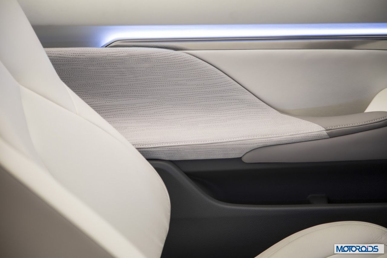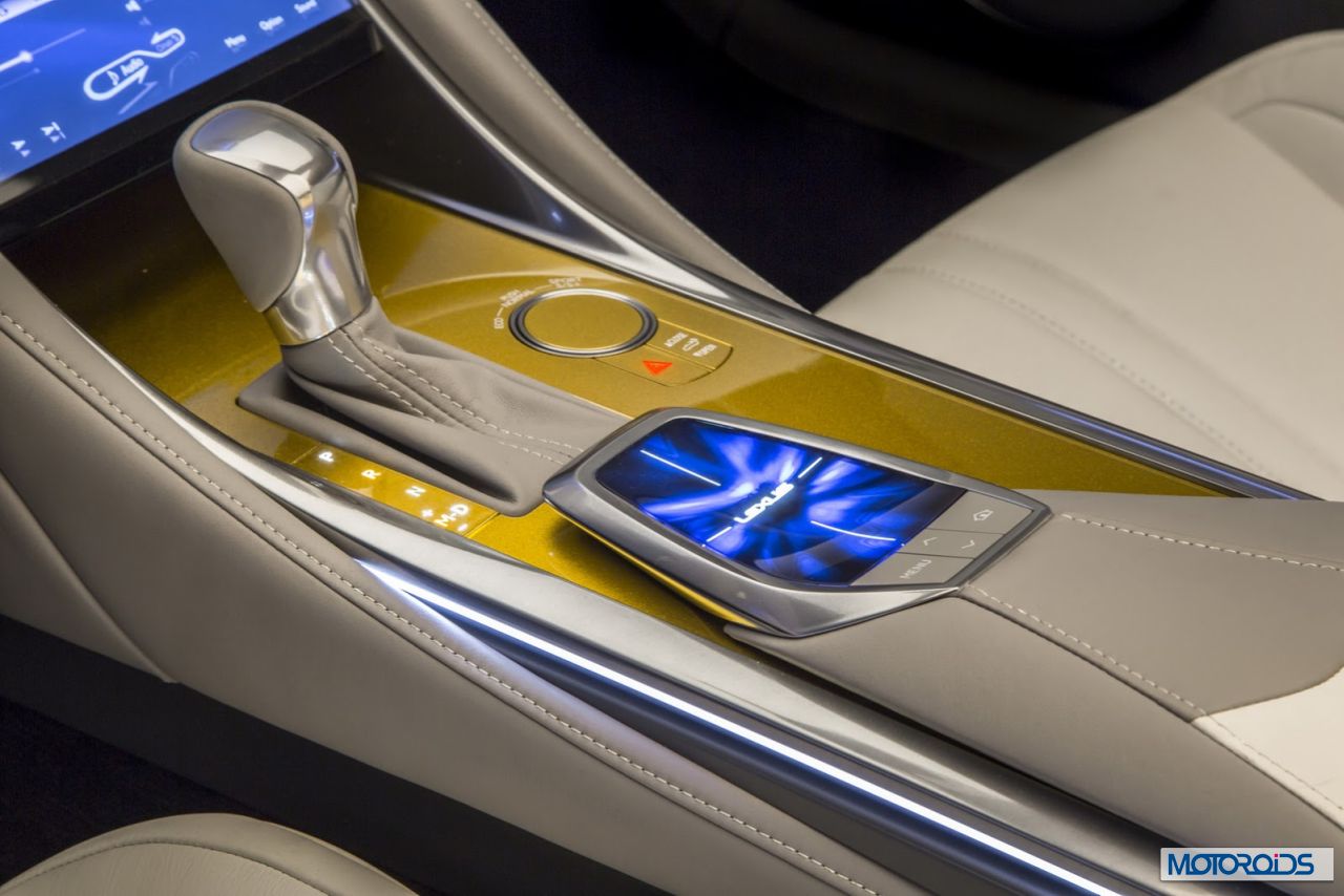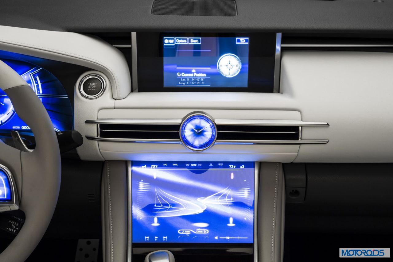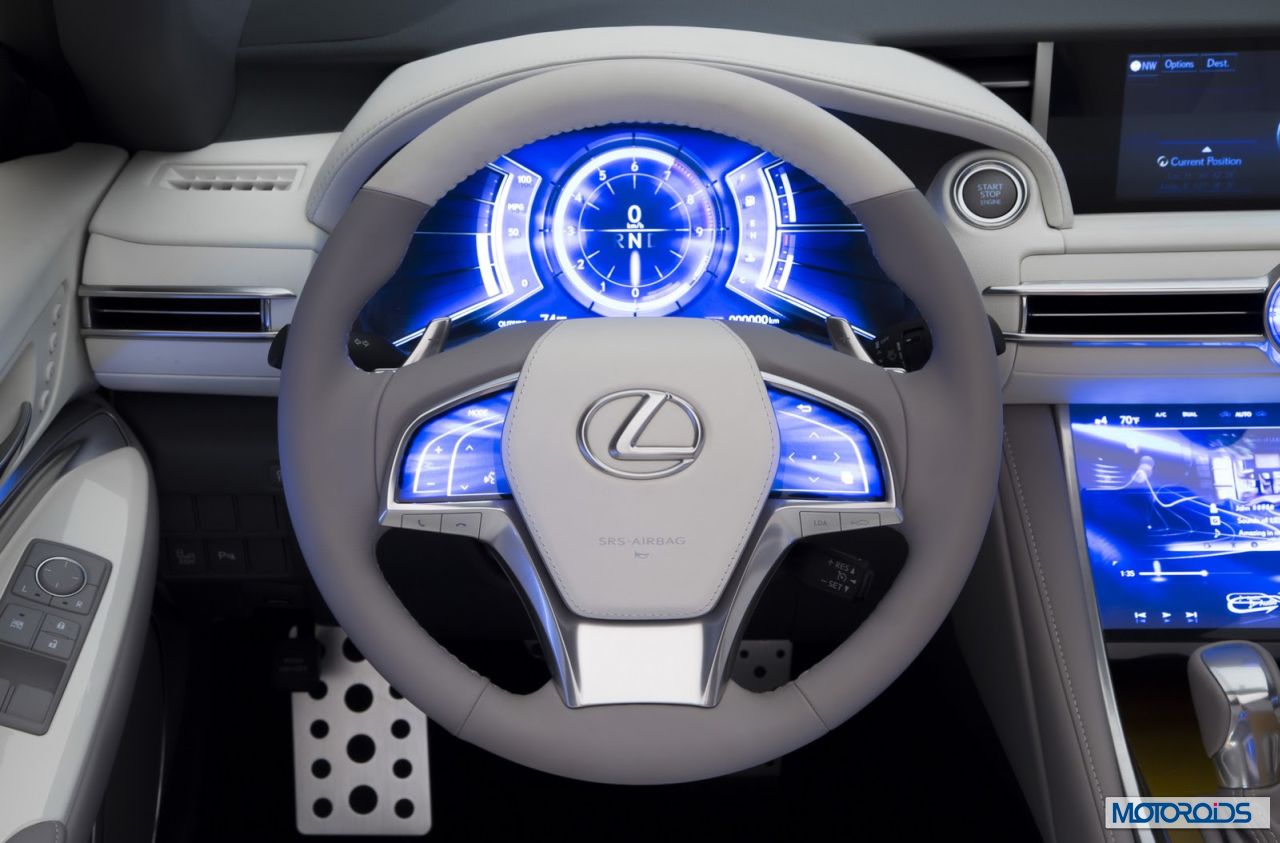 The cabin is decidedly next-gen with white and grey being the only two hues used by the designers at Lexus to create a unique ambience. All the screens are white and blue backlit, endowing the LF-C2’s interior a light, amenable look. Even the steering wheel has screen on its two spokes. The exterior extends into the cabin as the center console originates from the rear deck and runs down the length of the cabin all the way to the dashboard. The thick leather-wrapped steering wheel implies that this is a driver’s car, as do the form-fitting seats.