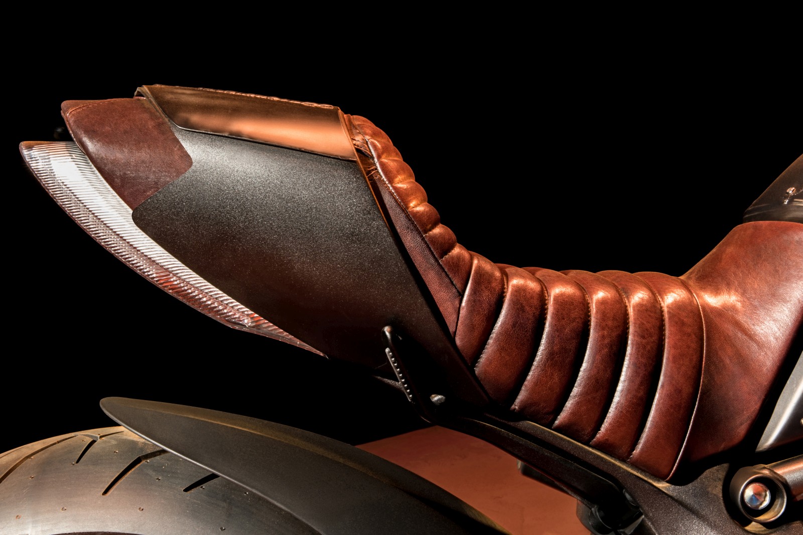 The Ducati Diavel Diesel is characterized by a hand-brushed stainless steel superstructure with visible welding and rivets. Details like the tank cover, front cowl, and passenger saddle cover are examples of craftsmanship and style. The saddle, made of real leather, is unique to this Diavel, on which the pyramid motif appears: the three Ds of Ducati, Diavel, and Diesel.