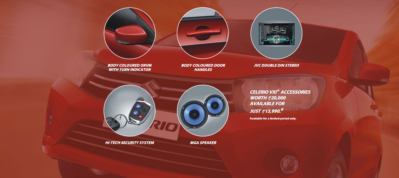 This limited edition Celerio VXi+ comes with cosmetic upgrades like body coloured ORVMs with integrated turn indicator and body coloured door handles. The Celerio VXi+ also comes packed with a JVC Double Din Stereo, MGA Speakers and a Hi-Tech Security System. The total cost of the accessories is Rs 20,000 but Maruti is giving away the add-ons at Rs 13,990. That’s nearly Rs 7,000 less than the original price.
