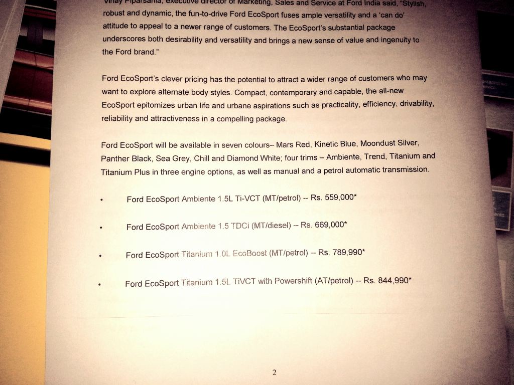 Rs 5.59 lakh is for the 1.5 liter Ti-VCT engine base variant. Ecoboost will be more expensive. Stay glued for detailed prices