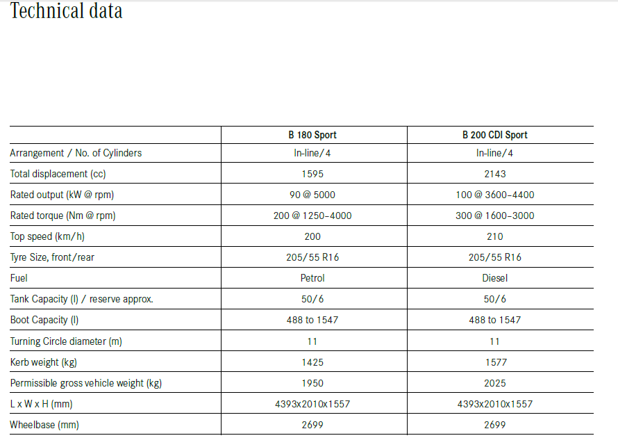The B 200 CDI continues with the 2143 cc, four cylinder diesel engine, but now produces 300 Nm of maximum torque @ 1600-3000 rpm and a maximum power of 134 bhp @ 3600-4400 rpm, as compared to 250 Nm and 107 bhp in the previous guise. The B 200 CDI has a certified fuel economy of 19.0 Kmpl.