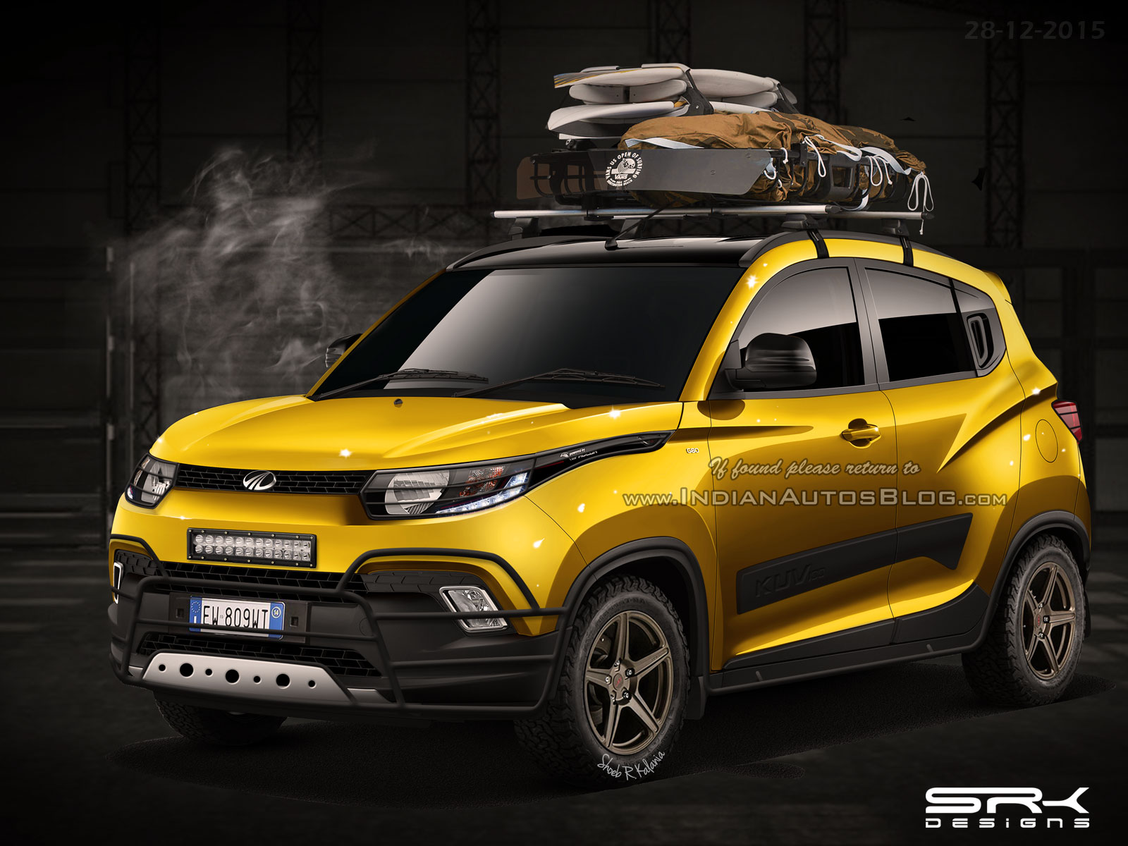 Indian Autos Blog’s rendering artist SRK has conjured up a Mahindra KUV100 that has taken a walk on the wild side. SRK’s rendition of the KUV100 dons a bright yellow paint-job, contrasted well with a gloss black roof and mirror caps, along with jet black window tints Atop sits a luggage rack, replete with camping gear and other outdoorsy paraphernalia.