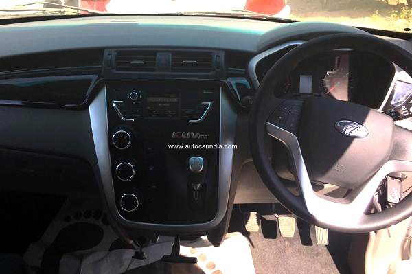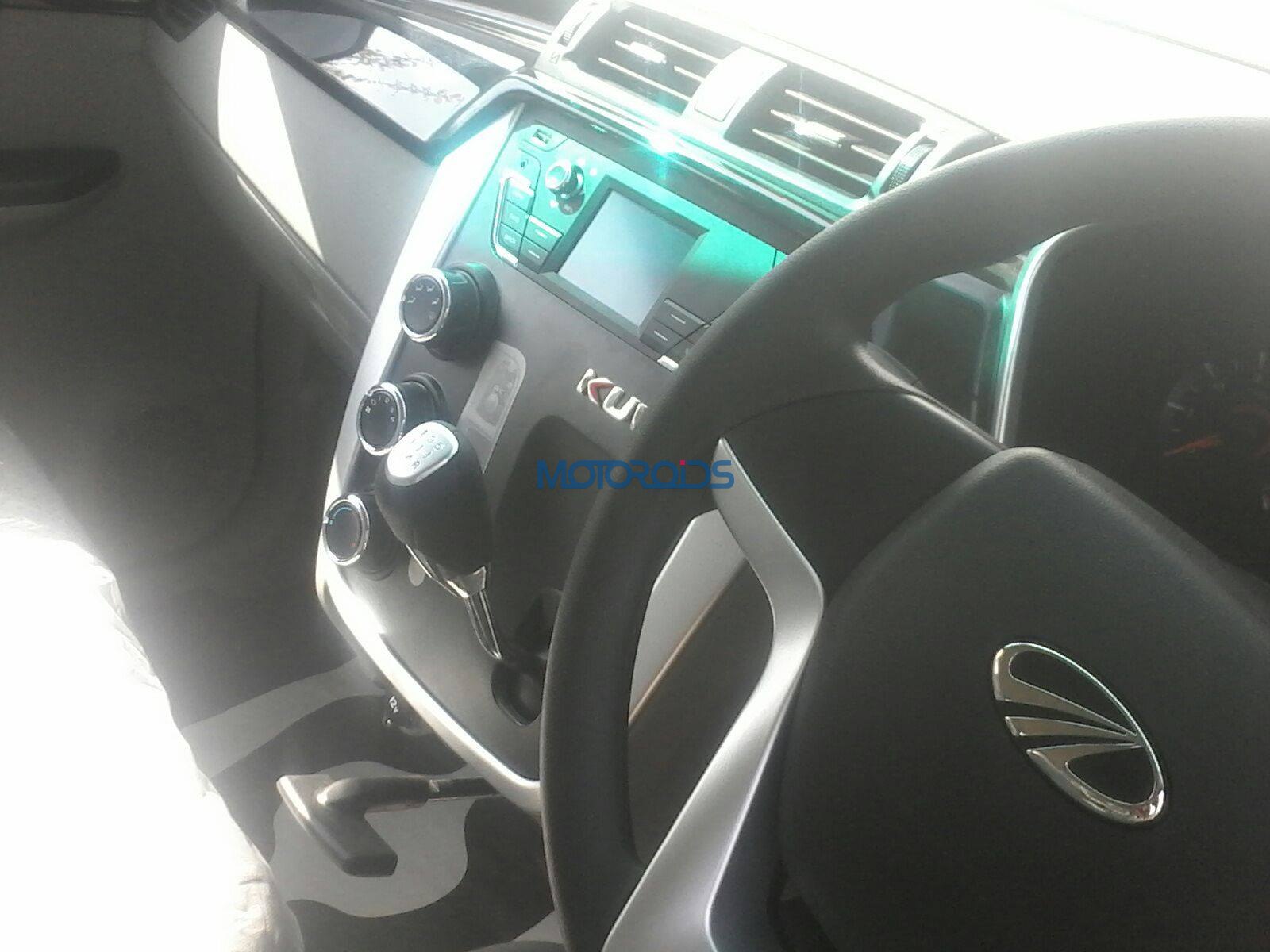 Update: Motoroids Reader and fan Sarang Wani has shared this fresh new image of the interior of the KUV100, revealing the dashboard and centre console in a much closer detail. What we see here more clearly is the shifter stick finished in black and chrome jutting out of the centre console, the vertically stacked control knobs and a satin silver finish on the steering and different panels. Read on for a more detailed description of what the interior of the new compact crossover looks like.