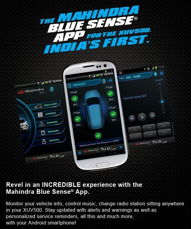 Mahindra and Mahindra has launched a first of its kind app for android devices. Named as the Blue Sense, the new android app helps XUV500 owner/user in monitoring the vehicle info. It also enables the user to control music/radio from any place inside the XUV500. The app also helps the user in staying updated with alerts and warnings as well as personalized service reminders.