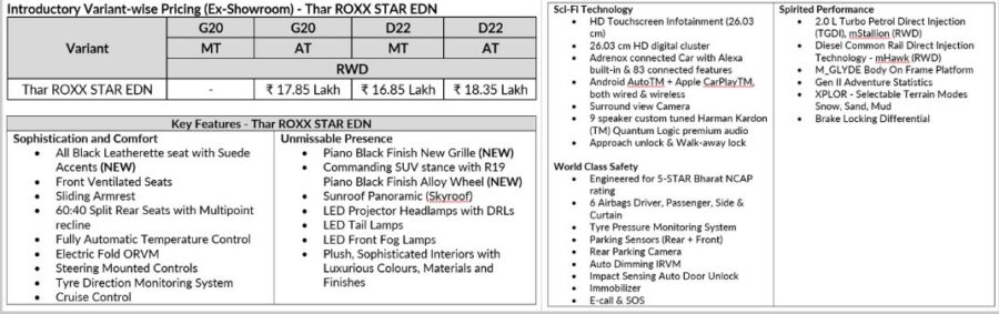 Safety has not been forgotten. The Thar Roxx Star Edition is engineered for a 5-star Bharat NCAP rating. It comes with six airbags, tyre pressure monitor, front and rear parking sensors, rear parking camera, auto-dimming IRVM, impact sensing auto door unlock, immobiliser and SOS e-call.