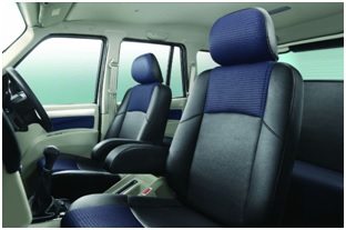 - Faux leather seats with blue fabric insert