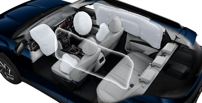 Comfort features include dual zone climate control, rear AC vents, wireless phone charging, USB ports for front and rear passengers, and 60/40 split rear seats. The driver gets a height-adjustable seat, keyless entry, push button start, auto headlamps and rain-sensing wipers.